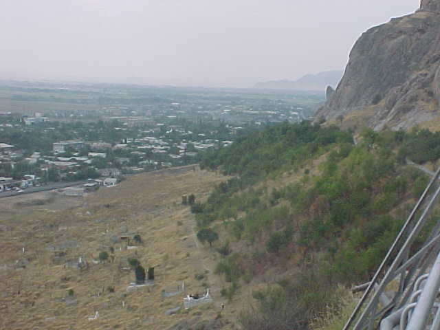 歩道はモスクまでで終わっており、山の頂上に行くには岩場を通るしかない。岩場は崖になって切れ落ちており、少しでも道を踏み外すと転落してしまう悪路だった。私は頂上を目指して慎重に登った。頂上はまだだいぶ先だったが、そこまで行くと100%生きて帰ってくる自信はなかったので、途中の少し平らになっているところでやめた。そこから、オシュの綺麗な町並みを見渡せた。中でも印象的だったのは、街中で貧富の差がはっきりと現れていたこと、そして政府が家不足解消の為に空き地を開放した結果、都市の周辺でスプロール化が進んでいることだった。