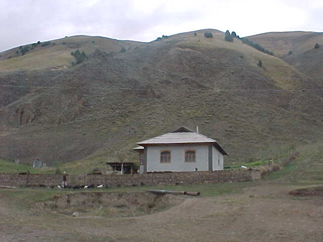 かなり広い谷に沿って車に乗ること10分。道路の周囲には、結構集落が密集している。市場経済化が進むにつれて、人々は都市で高い現金での所得機会をもとめ、農村は過疎になっていくことを考えると、まだキルギスには市場経済が全国的に浸透していない事がうかがえる。道の真ん中で車をおり、あまり整っていない、糞がその辺りに散乱している山道を通って、ソクタシュSoku Tashという集落にたどり着いた。この集落には、電線や水道はあるが、その他は自然そのままといった感じの農家であった。電話は無い。
