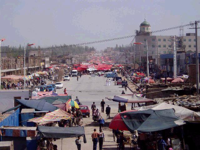 人民広場のある町の中心地から北東に1kmほど離れたところに、ウイグル人の巨大なバザールがある。ほとんどが露店で、ビニールシートの屋根の下に店がぎっしり入っている。
