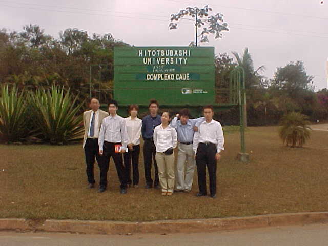 再び出発。途中、国道からの分かれ道があり、大きなユーカリの森を車窓に見ながら、イタビラの町へ入 る。かなり大きな町だ。さらに行くと詩人の銅像があり、そこから最初の目的地である、リオドセ社 (Companhia Vale do Rio Doce) のゲートへ。しかしここでも道が二つに分かれており、最初間違えてしま っていた。引き返して正しいルートを辿っていくと、入口には「HITOTSUBASHI UNIVERSITY ようこそ いら っしゃいませ」の看板。この視察は、リオドセ社と深い取引関係にある日本の商社、双日のご担当者の御好 意により実現したものである。ちなみに、この日は日曜日。にもかかわらず、こうしてわれわれを大きく歓 迎してくださった双日とリオドセ社に、あらためて深く感謝した。