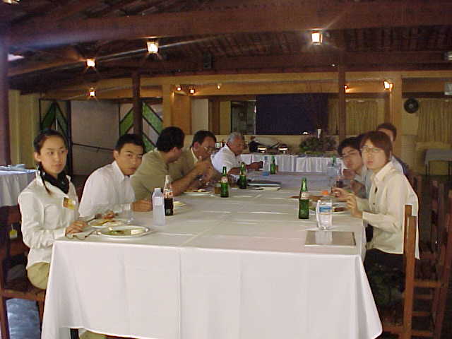鉱山の視察後、リオドセ社のご好意による昼食をいただく。リオドセ社が顧客によくすすめているレスト ランらしく、リゾートのような雰囲気で、これまでの巡検の中でも1、2を争うおいしさだった。多彩なメニ ューが、ブラジル特有のシュラスコの単調な味に半ば飽きていた口によくあう。しかも、この国のデザート は概して日本人の口には甘すぎるものだが、今回出されたバナナを使ったデザートはそこまで甘ったるくも なく、ゼミテンの間で非常に好評だった。最後にはリオドセ社から、ここで採掘されたロウ石を使った磁石 までおみやげにいただいた。
