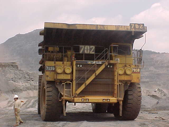 バスは展望所から降り、巨大なトラックのあるところでわれわれは下車した。タイヤだけでも人間二人分 近くの高さがある。トラック本体はコマツ製、タイヤはブリジストン製だった。これだけ巨大なタイヤの需 要は、日本には無い。しかし、日本は、このようなものもわざわざ生産して、輸出しているのだろう。この トラックは、平坦なところはディーゼル式で動くが、急斜面ではよりパワーの強い電気エンジンを利用して いる。リオドセ社の方のご好意により、トラックに乗ることができた。乗るというより、のぼると言ったほ うが正しい。トラックの上から見下ろした時の高さに、ゼミテンの多くがはしゃいでいた。