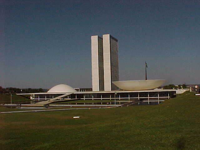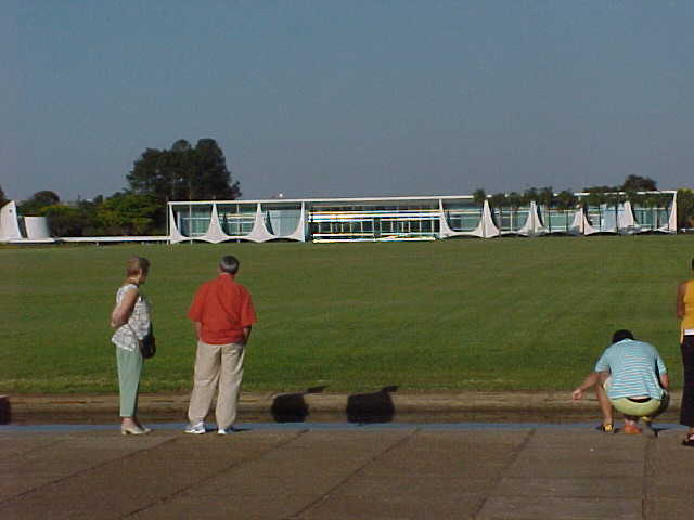 三権広場に着く前に、国会議事堂が目に飛び込んできた。 中央に1対のビルがあり、通りから見て左側のお椀を伏せた形をした屋根を持つのが上院で、受け皿のような形をしているほうが下院である。 これもオスカー・ニーマイヤーの作品であり、上院は日の出、下院は日没をイメージしているのだという。 われわれはバンを降り、国会議事堂をバックに記念撮影をした。