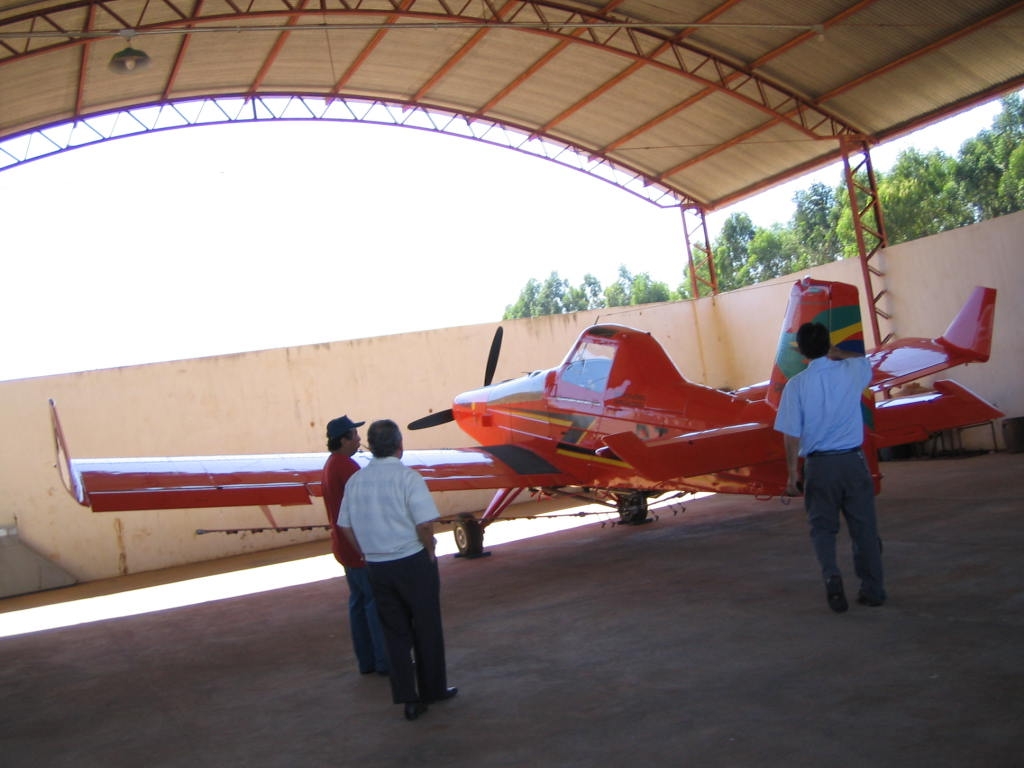 堀田農場の中をジープで案内していただいている途中、飛行機の格納庫を見せていただいた。赤い小型機である。もしやと思って会社名を探すと「ENBRAER」という文字を見つける。ENBRAER社は3日に訪れたブラジル民族資本の航空機会社である。値段を聞いてみると20万ドルだそうだ。地上20mの低空飛行で、一日800haの耕地に農薬を散布できるという。一般人には操縦が難しいので、この飛行機専用の腕のいいパイロットを雇っているらしい。各区画に一つの飛行機があるので、堀田農場には計3つの飛行機があるということになる。ちなみに、その納屋の側には馬を飼っている牧場があった。
