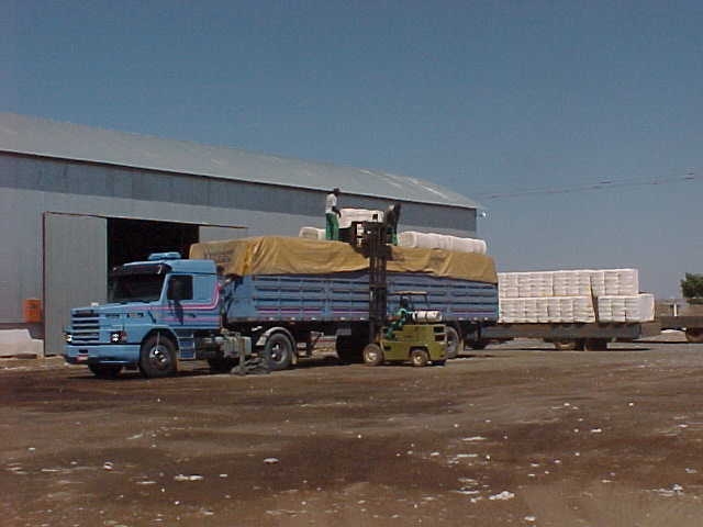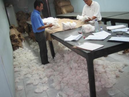 筒状の屋根の大きな倉庫に、圧縮された一つ200kgの荷物が山積みになっている。その一部は、1000km離れたサルバドールに向けて出荷される。敷地の中に、大きなトラックがいくつか止まっていた。実際、トラックが荷台いっぱいに綿を積みこんでいる場面にも出くわした。綿はトラックに運ばれて、この加工・運送拠点から出て行く。われわれも後で移動中に確認することができたが、運送中、そのトラックから綿が道路にこぼれる。その綿を貧しい人々が拾い集めて布を作るという。 次に、綿の格付けをしている現場を見せてもらう。なにやら作業服を着た男の人が、綿を少し引きちぎり、感触を確かめている。