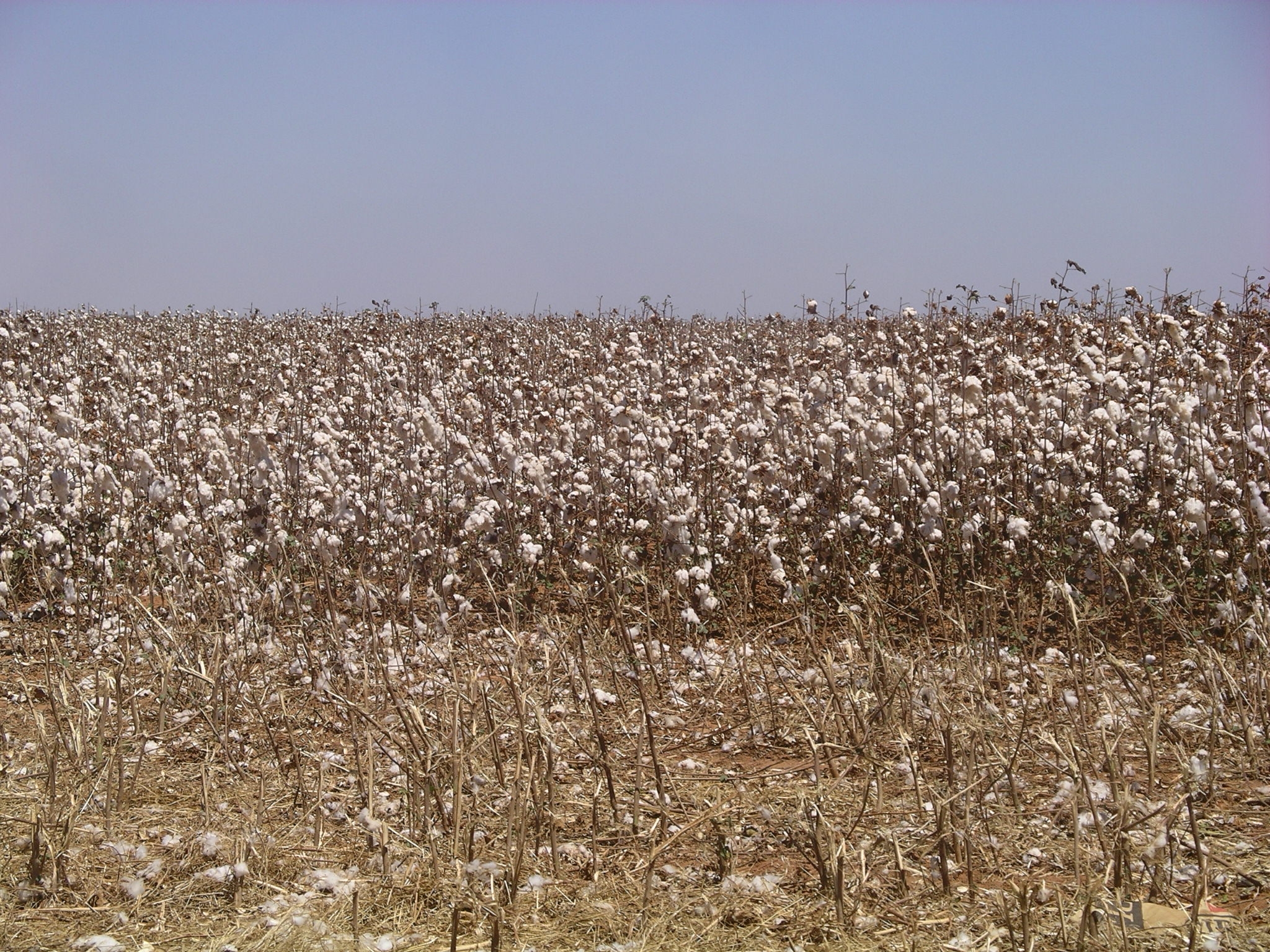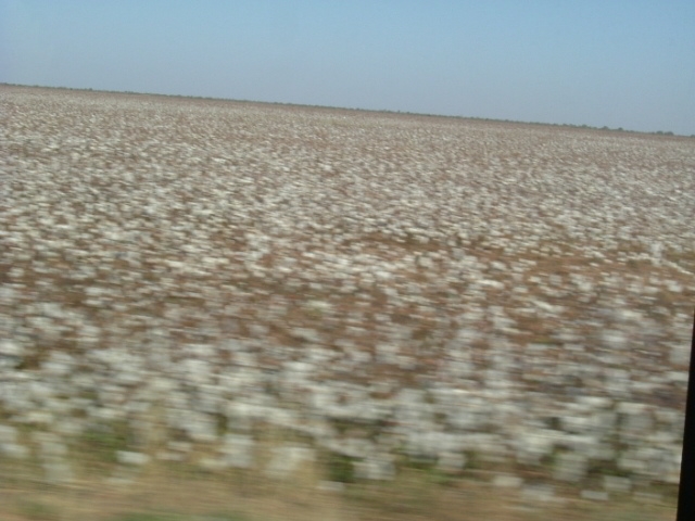 車の中で、新田さんから綿農業についてお話を伺った。12月、1月に緑の絨毯のような綿畑は5月には真っ白になり、6月から8月にかけて収穫期を迎える。4月から9月は乾季で雨が降らないため、綿花がいたまず高品質ものが収穫できるそうだ。車の窓越しに、9月というのに窓からまだ白さが残る綿畑を見た。収穫が遅れているらしい。