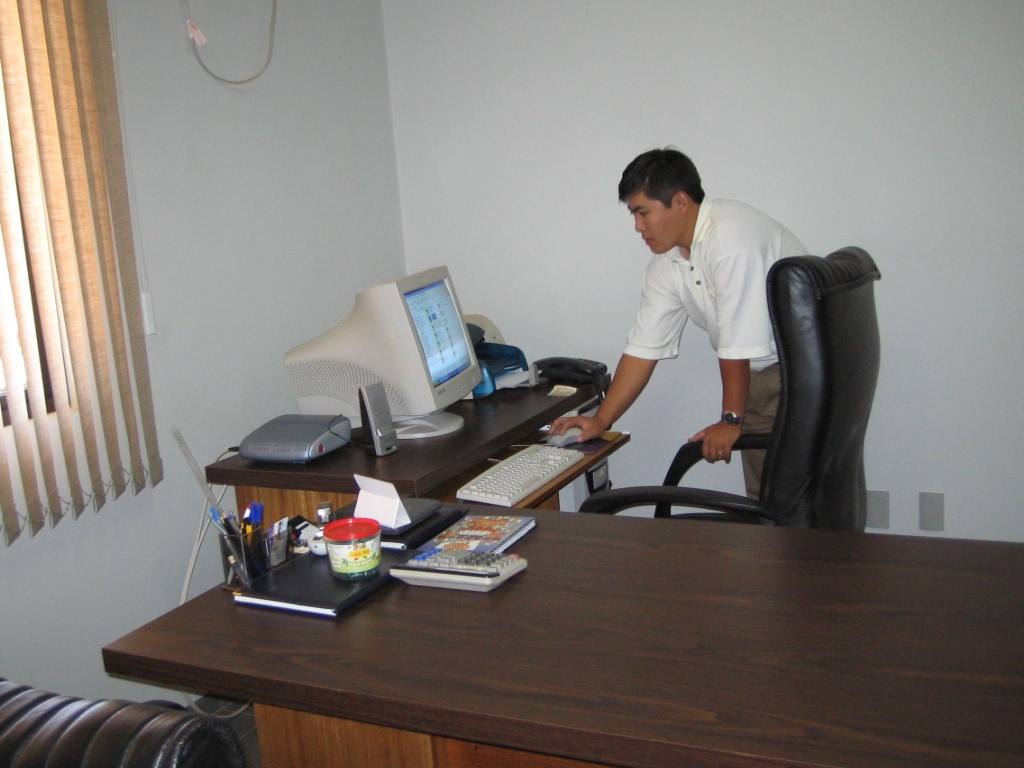 事務所ではコーヒーとクッキーをいただいた。新田さんが、同じ大学の農学部で知り合って結婚したという奥さんを紹介してくださった。夫婦二人で5,800haの耕地を共同で経営しているそうだ。事務所には、もう一人パソコンに向かって仕事している従業員がいた。新田さんの個室に入れてもらう。新田さんがパソコンで何かをチェックしていた。一瞬、経営者の顔に戻る。