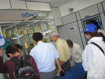 ここは、南米第二の基地だそうだ。一番目の基地はアルゼンチンにある。Bungeでは、地元農家から大豆買い取って加工し、いろいろな製品を作っている。基本的に、生の大豆は輸出し、加工品は国内で販売している。で大豆から精製した食用油はブラジル市場向けに、絞りかすは飼料としてヨーロッパに輸出する。マーガリンも生産しており、主にサンパウロで販売するという。一方で、加工しない大豆も取り扱っており、主に輸出向けとして年間20万t売る。