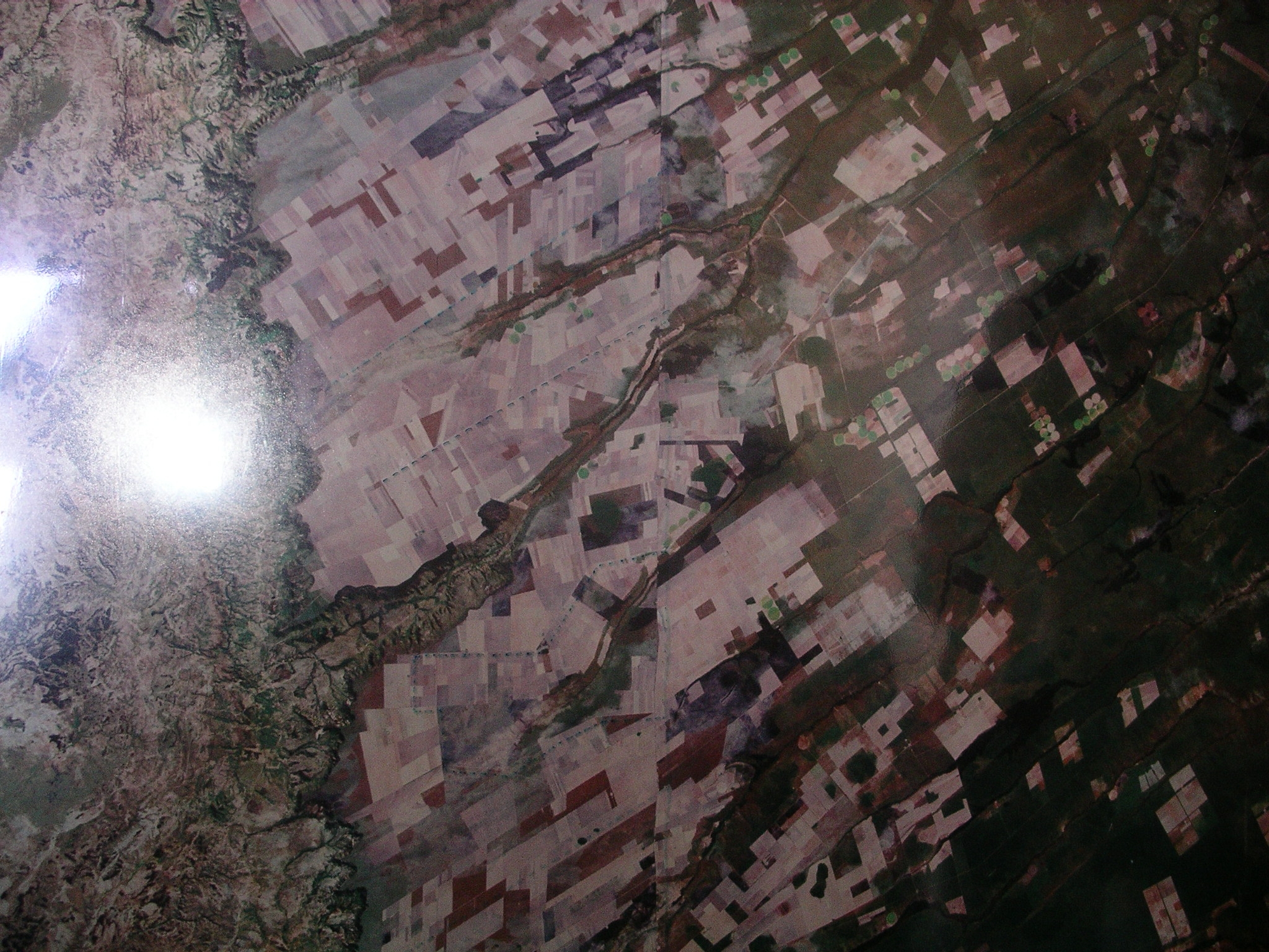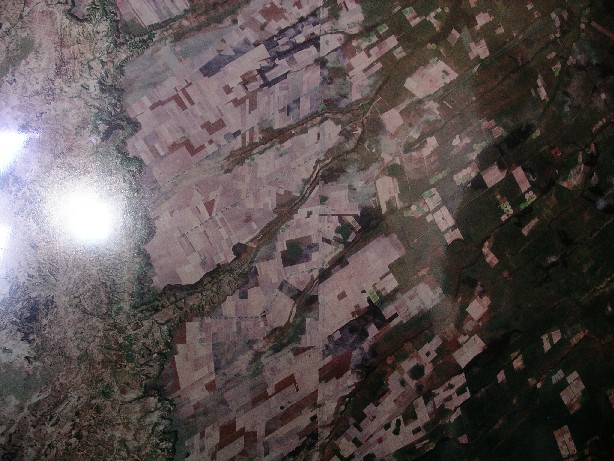 メストレ台地は、海抜900mであり、平らな土地の広さとしては世界第2位である。その面積は400万haを誇り、オランダの国土に匹敵する。トカンチンス州とバイーア州の境には標高差400mの崖がある。アマゾンで湿気を帯びた風がトカンチンス州を通ってその崖の上まで約400m上昇する。その間、風は温度を2.4℃低下させるため、崖を越えたところ、すなわちバイーア州のメストレ台地の西の端に、大量の雨を降らせるのだ。これが、この地域の農業の基盤になっている。しかし、メストレ台地でも高地から少し離れた地域はその雨にありつけず収量が低い。そういった地域には、ブラジル第3番目の大河であるサン・フランシスコ川から水を引いてくるのだという。川の水はセンターフロートという巨大水撒き機によって、一気に150haの耕地に撒かれる。センターフロートは長さ600mの棒状のもので、水を撒き散らしながら片方の端を中心に24時間かけて一回転する。後でみたメストレ台地の衛星写真からそこだけ色の違う円形をいくつも確認することができたが、センターフロートによるものである。
