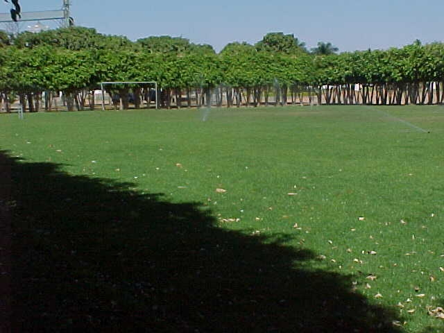 大豆を貯蔵したサイロやトラクターを見終わった後、事務所のそばにある良介さんの別宅に向かって歩いた。良介さんは仕事のため別宅によく泊まるが、残りの家族はバヘイラスの本宅に住んでいるという。別宅に通ずる並木道の左側にはサッカー場があり、スプリンクラーが勢いよく水を噴いている。このサッカー場は従業員が休み時間などに使うそうだ。ちなみに、堀田農場には、常時300人から400人の従業員がおり、収穫期には1000人にもなるという。農場の中には従業員用の食物を作る畑や家畜がある。