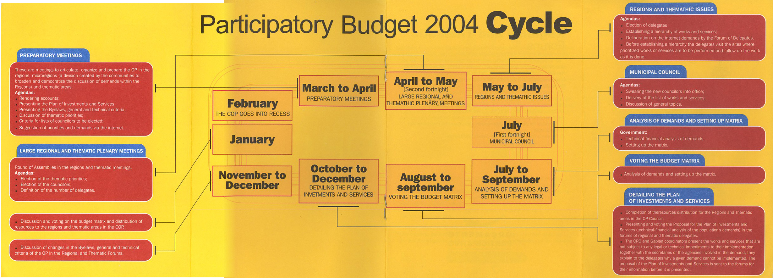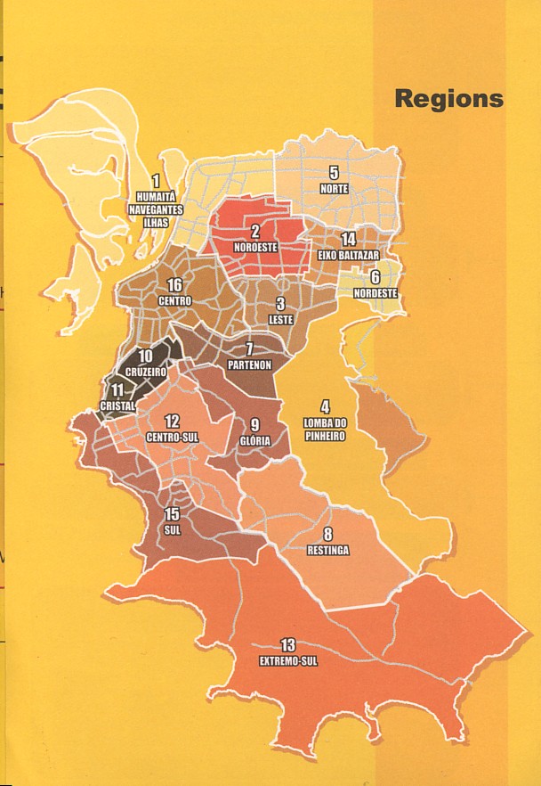 ポルトアレグレは人口130万人の都市で、市の中が16の地域に分かれている。16の地域それぞれに予算について話し合う総会が存在し、その区域ごとに、住居に予算を費やすかそれとも教育に予算を費やすかといった、支出のプライオリティーを決めていく。小さなミーティングは3〜4月に始まり、4〜5月に地域ごとに住民を集めて大きな総会が開かれる。ここで参加する住民が多いほどその地域での発言権が大きくなるので、多くの住民が参加するようになる。地域の総会は特定の選ばれた人ではなく、ポルトアレグレの市の住民なら誰でも参加できる。地区ごとの総会と並行して、各地区の地域代表者(デレガード、Delegados)のフォーラムも開かれる。こちらでは5つのテーマ別に話し合いの場が持たれる。ここで一般市民は議決権を持たないが、フォーラムの様子を傍聴することが出来る。その後、各地区の総会・フォーラムの中からそれぞれ2人ずつの評議員を立て、COPと呼ばれる予算評議会の場へ審議が移され、9月下旬までに来年度予算の詳細が決まる。議会の段階同士でリコールも可能となっており、ガバナンスはしっかり行き届いている。