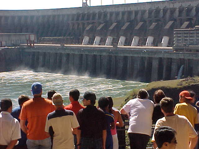 その後、イタイプダムの専用バスに乗り込み、ダム見学ツアーに向かう。観客を乗せた10台ものバスの列は、ダムが最もよく見える石造りの展望場で停車した。黒部ダムなど、日本の水力発電は普通高い山の中にあり、高低差を利用して小数の発電機で発電するが、イタイプダムは、高さがないかわりに幅があり、多数の発電機並列させ、平地のダムながら高出力の水力発電ができるようになっている。これは、アメリカ合衆国の技術ということだ。コンクリートの壁のようなダムは、展望場からかなり離れた対岸にあるのに大きく、遠近感がわからなくなるほどだった。