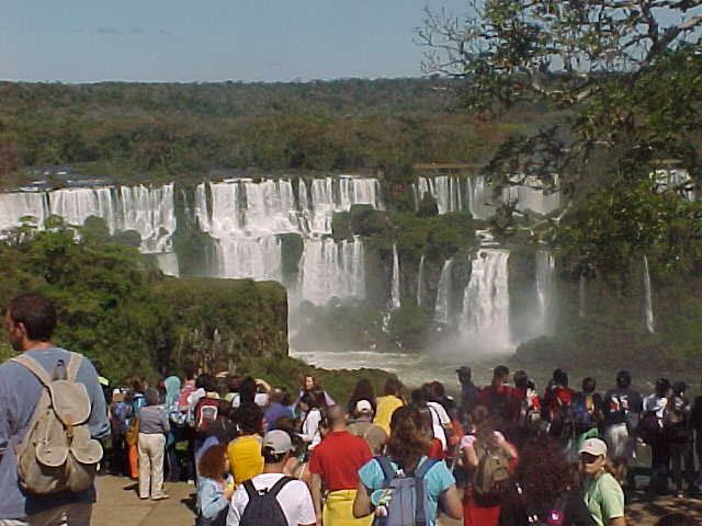 周りの観光客は、白人が最も多く、中国人や日本人も見られた。ツアーで訪れる人が大半のようである。とくに、ブラジルの他のどこよりも、中華人民共和国の中国人が多かった。商工会議所のような中国人団体客の記念写真も、フォトショップに飾られていた。中国では、はるばるブラジルまで海外旅行にこられる新上流階級が増加しているのだろうか。著名観光地ばかりをまわるのは、中国人観光客の観光嗜好レベルが初期段階にあるということなのかもしれない。。イグアスの滝は、歴史や知識など、背景の理解が必要な観光地ではなく、巨大な滝はその凄さが直感的にわかりやすい。そこからわっと人気が広まったのではないではないだろうか。景気よくどんどん流れてくるイグアスの滝は、ブラジルに観光に来られるような新上流階級の中国人にとって、追い風に感じられるのかも知れない。