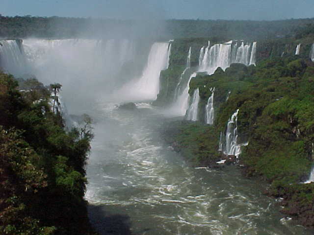 さて、イグアスの滝だ。インディオの言葉で「巨大な水」という意味のとおり、次から次に水が惜しげもなく溢れてくる。約4kmにわたって大小275の滝があるのだそうだ。以前ナイアガラの滝を見たときは冬で、氷の壁に囲まれて押し寄せる大きな水の塊ひとつ、という記憶があるが、簡単にいえばイグアスには275個ナイアガラがあるようなものだった。30分ほど遊歩道を歩く間、常に右側に滝があり、二段、三段になって褐色の岩々の間を流れ落ちる水の勢いは圧巻だ。目印にバット風の風船を手にした熟年団体と同じペースで私たちは滝を回った。国境の向こうにアルゼンチン側を見渡すと、そこには遊覧船などが浮かんでいる。あちらのほうが、観光開発という点ではすすんでいるようだ。