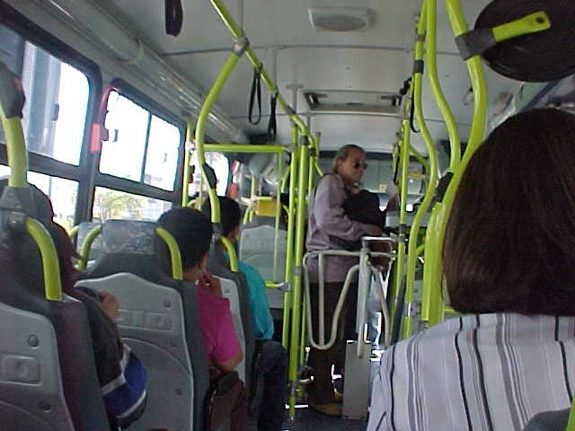 乗車の仕組みはこうだ。前のドアから乗ると、車掌のような係の人がドア近くに座っているので、彼に運賃を渡す。そして銀色の回転式ドアからバスの中央、後部座席に移動する。ところが、ここで人によって運賃が違うことが発覚! 私や琴美ちゃんは2レアルだして25センターボのおつり、荒木さんは5レアルだしたのに、30センターボのおつりしかくれない。朝田さんは、2レアルだして、30センターボかえってきた。これから後もよくあったことだが、おつりのためのコインがないようだ。でも他の乗客の誰も疑問を抱かない。日本だったらありえないし、なくても何とかしてきちんと返してもらうだろうな、と思っていたら! バスの前後のドアが開きっぱなしで走行し始めた! 「あの・・・開いてますけど・・・。」しばらく走ってから、ドアは走りながらゆっくりと閉まっていった。一同なんだか大笑い。