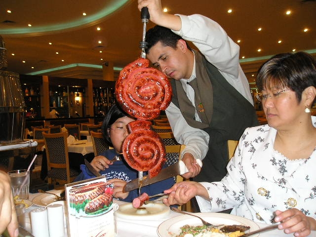 シュハスコ料理とは、長い串に大きな肉の塊や太いソーセージが渦巻状になったものを刺してウェイターが次から次へと持ってきてくれるのだ。「スィ、ポルファボール」といえばウェイターがナイフで薄く切ってくれるので、手持ちのつかみバサミでそれを取って、いただく。「ノン、オブリガーダ」というまでこれが延々と続く、食べ放題のシステムである。これからの長いブラジル生活中にイヤと言うほどこのシュハスコ料理を食べることになろうとは誰も思わず、これから貧しい食事だろうと体力を温存しとくためにも皆がっつり食べた。
