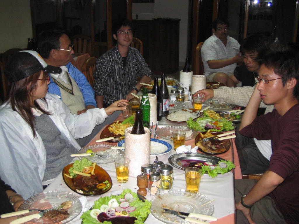 全員、おなかがすいたので、ホテルのレストランで夕御飯をとることにした。長いバス移動や国境越えのトラブルでの精神的ストレスから今ようやく解放されたせいか、みなの機嫌は非常によい。全員、ビールを水のごとく消費していく。その時、結局ビールはCuatro(4)本 × Cuatro(4)回のオーダー =16本にのぼった。全員、気持ちよくCuatro!と店員に叫んでオーダーし、運ばれてくるや否やグビグビと飲んでいったのだった。