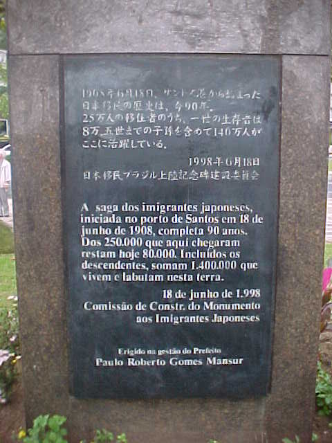 記念碑は、日本語とポルトガル語が併記されており、1998年当時の日系人の人口数が書かれていた。それによると、現在存命の日系人は140万人で、そのうち1世は7万人だという。私達は、日本から距離的に最も遠い国の一つであるブラジルに移民としてやって来て、立派に生き亡くなられた人々に、黙祷を捧げた。