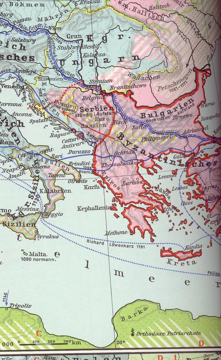 さて、トルコ系のブルガール人によって建国されたブルガリア帝国は、ビザンツ帝国と激しく争い、8世紀にはバルカンの大部分を支配するようになり、マケドニアもブルガリア帝国の支配下となった。しかし、異民族やビザンツ帝国との戦いで疲弊し、帝国はしだいに弱体化する。そして11世紀初頭、ブルガリア帝国はビザンツ帝国に征服されて滅亡し、マケドニアも、この時期から再びビザンツ帝国領となった。