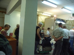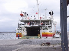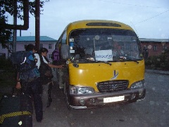 午後5時40分上陸。私たちは、フェリーの乗船客の中で最後尾になってしまった。出入国管理所行きのバスは、一回に係官の処理が可能な人数しか運んでゆかない。このため、船内の車両甲板で、延々70分ほど待たされた。車両甲板には、大型のトラックや、ポーランドから日本に陸路車で来て、またシベリアを経由し車で帰るという、遠征隊の機材を積んだ自動車などが見受けられた。