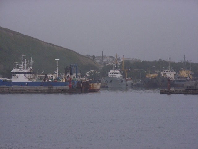 船の窓から、海岸段丘が岸近くまで迫り、その山々の土が生々しくむき出しになっている様子が見えた。港には材木が山積みになっており、その横ではクレーンが鉄くずを引き上げていた。この鉄くずは貿易で海外に輸出されるか、ロシア国内に移送されるのであろう。