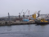 この、千歳/ロソセイ湾に突き出た埠頭は、戦前に日本が建設し、国鉄稚泊連絡船が使用していたものである。クレーンの立つあたりに、昔は「大泊港」という駅があり、連絡船から列車にスムースに乗り継いで、そのまま直通で、豊原/ユジノサハリンスクや、当時の日本最北の都市であった敷香(しすか)/ポロナイスクまで行くことができた。