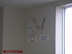 出国カウンターを通過すると、すぐ目の前に、稚内の時間を示す時計と、大泊/コルサコフ時間を示す時計が目に付いた。しかし、大泊/コルサコフ時間の時計は壊れていた。