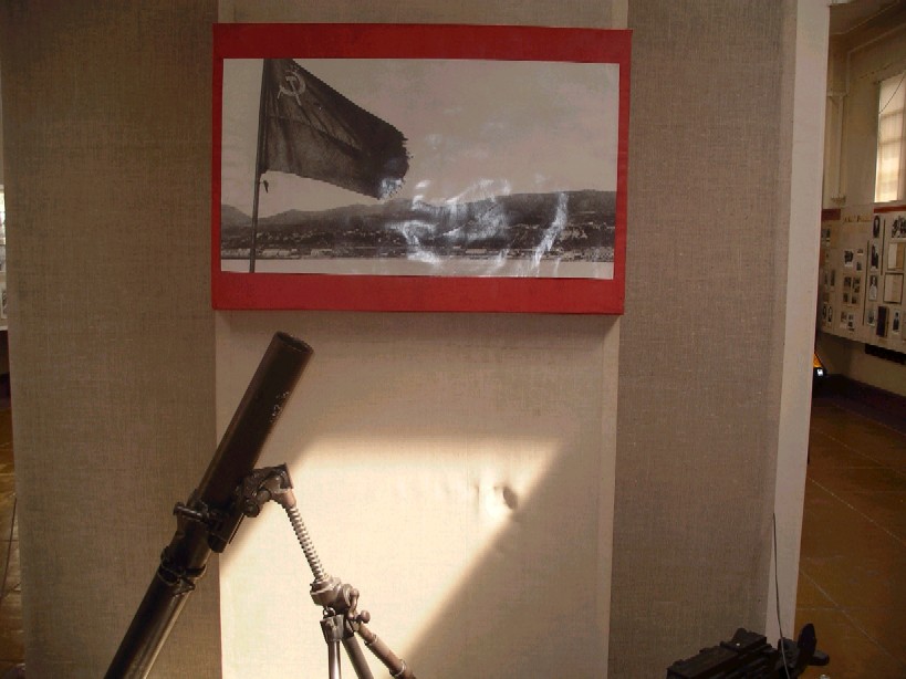 こうした日本の動きと対比するように、上のほう壁いっぱいに、ソ連の兵士たちが勇敢に戦うところを描いた大きな絵、ソ連軍の南樺太/サハリンおよび千島/クリル侵攻の様子を示した地図、ソ連の軍人たちの肖像写真や勲章などが展示されていた。ソ連軍の真岡/ホルムスク攻撃や、日本人が白旗を掲げる写真など、生生しい戦争の記録写真も目に留まった。