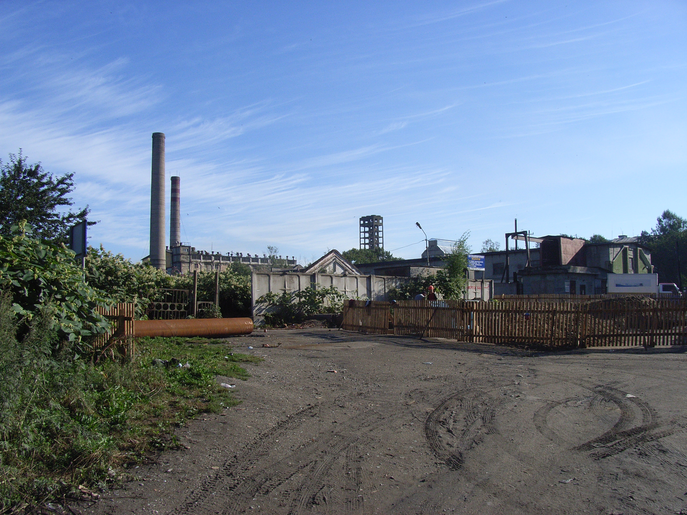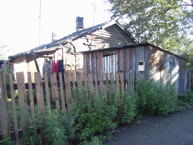 歩くこと約20分,ようやく街の北はずれ、ボマージナヤ通りなどの一帯に集まる旧王子製紙社宅群 についた。半ば崩れかけた木造の家が集まっていた。戦前の日本時代のものというだけあって、れんがでできた煙突は崩れかけ、屋根や壁に苔がむし,柵が倒れかけている。とても老朽化しており,日本の常識では人が住める状態とは思えなかったが,洗濯物が干してあることから人が今も住んでいることが窺えた。