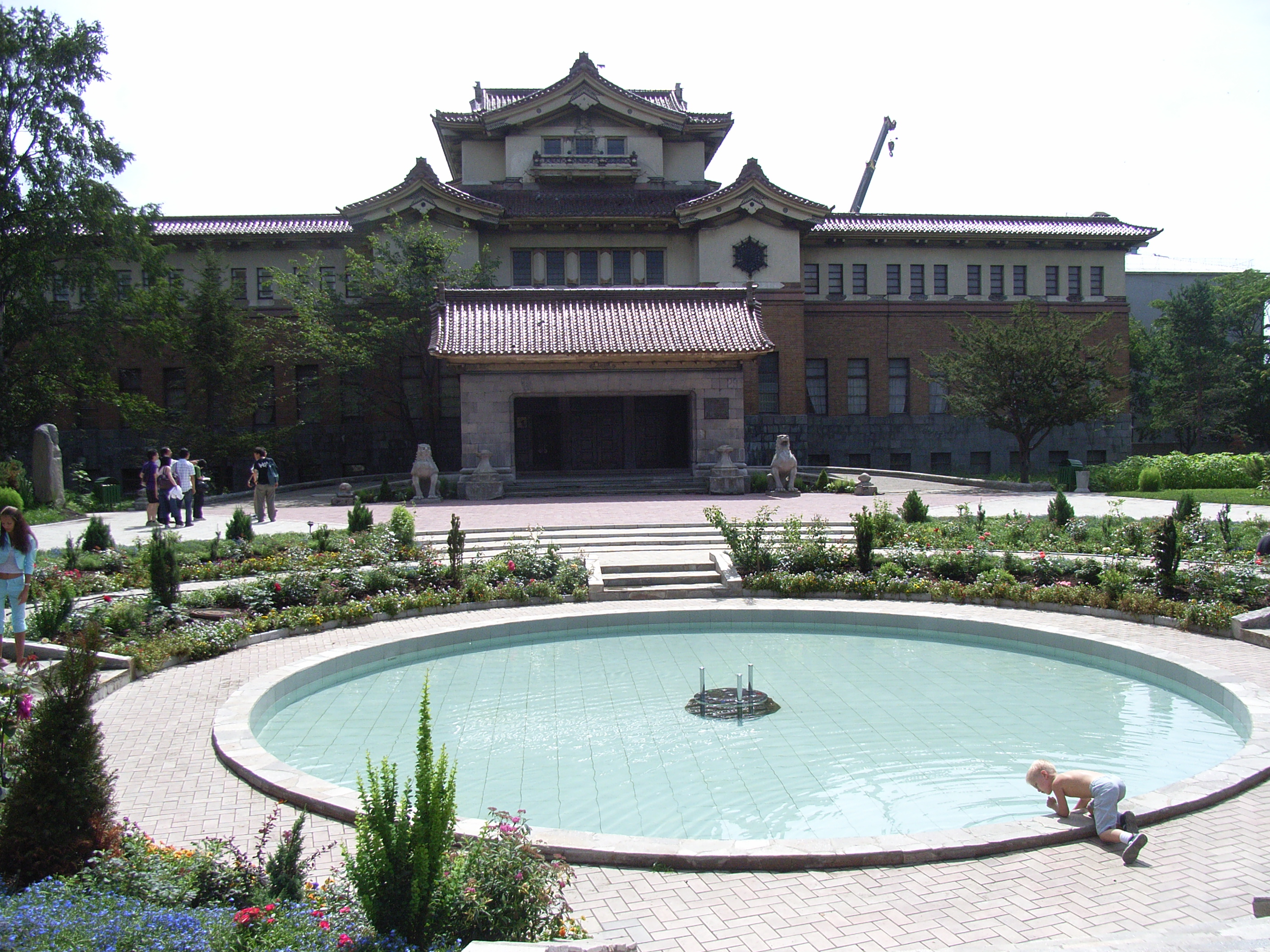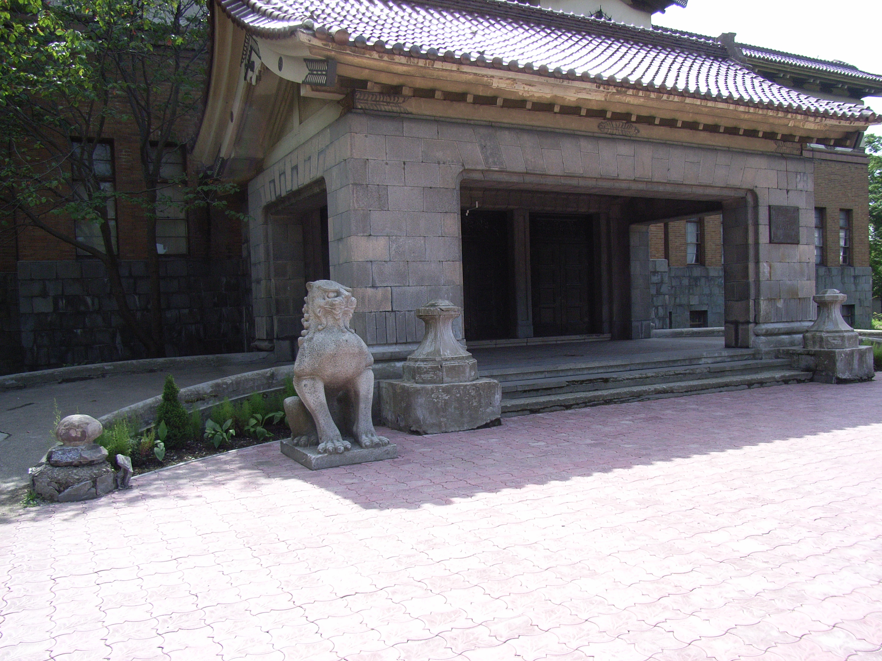 庭には、ドンと置かれた大砲がいかめしい空気を醸し出しているかと思えば、中心の整備された人工池の周りにかわいらしい花が植え込まれていたり、端っこにある池にはかわいいおもちゃの小鳥が浮かんでいたりなど、ちぐはぐで不思議な感じであった。しかし、これまで訪れた中では一番観光地として整備された施設であることは間違いない。博物館の玄関前脇には、日本時代の過去を象徴するように、神社にあった狛犬が移され置いてあった。
