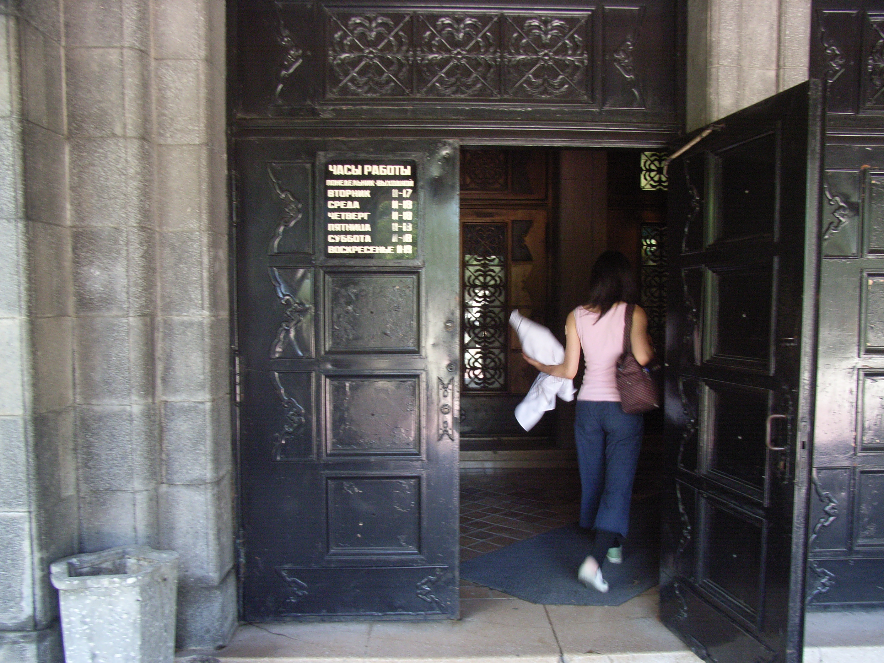 玄関の扉は、鉄製で重厚な感じである。昨日閉じていた入り口の扉は開いており、やっと中に入ることができた。博物館の入館料は70ルーブル、写真を撮影する場合はさらに40ルーブル払わねばならない。構成は、一階が自然遺産関係、二階が歴史遺産関係で、特に二階で多くの貴重な資料が見られた。三階建てなので、二階から上へと続く階段を登ってみると、開かない扉があった。三階はどうやら立ち入り禁止のようだ。