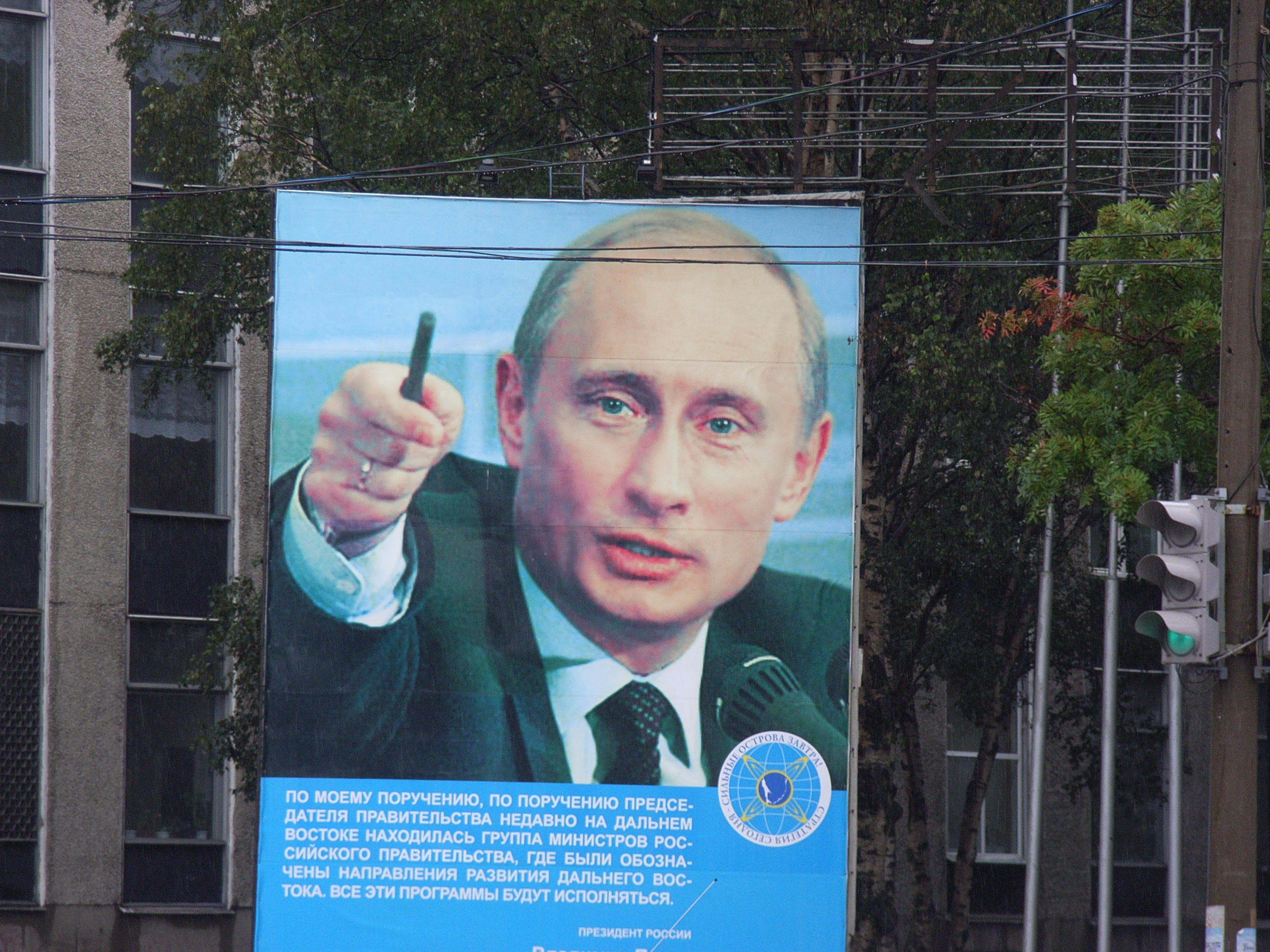 再びレストラン前で集合し、サヒンセンター前の通りに出ると、プーチン大統領の大きな看板が目に入った。この看板は、一昨日豊原/ユジノサハリンスク入りしてからちょくちょく目にしていたものだが、あらためてみなでじっくりと見た。プーチン大統領はまるで「開発しろ」とでも言っているようなポーズをとり、演説の一句が引用されている。ソ連時代の個人崇拝が戻りつつあることを示しているかのようだった。ただし背景が赤でなく青であることが、社会主義時代とは異なる。