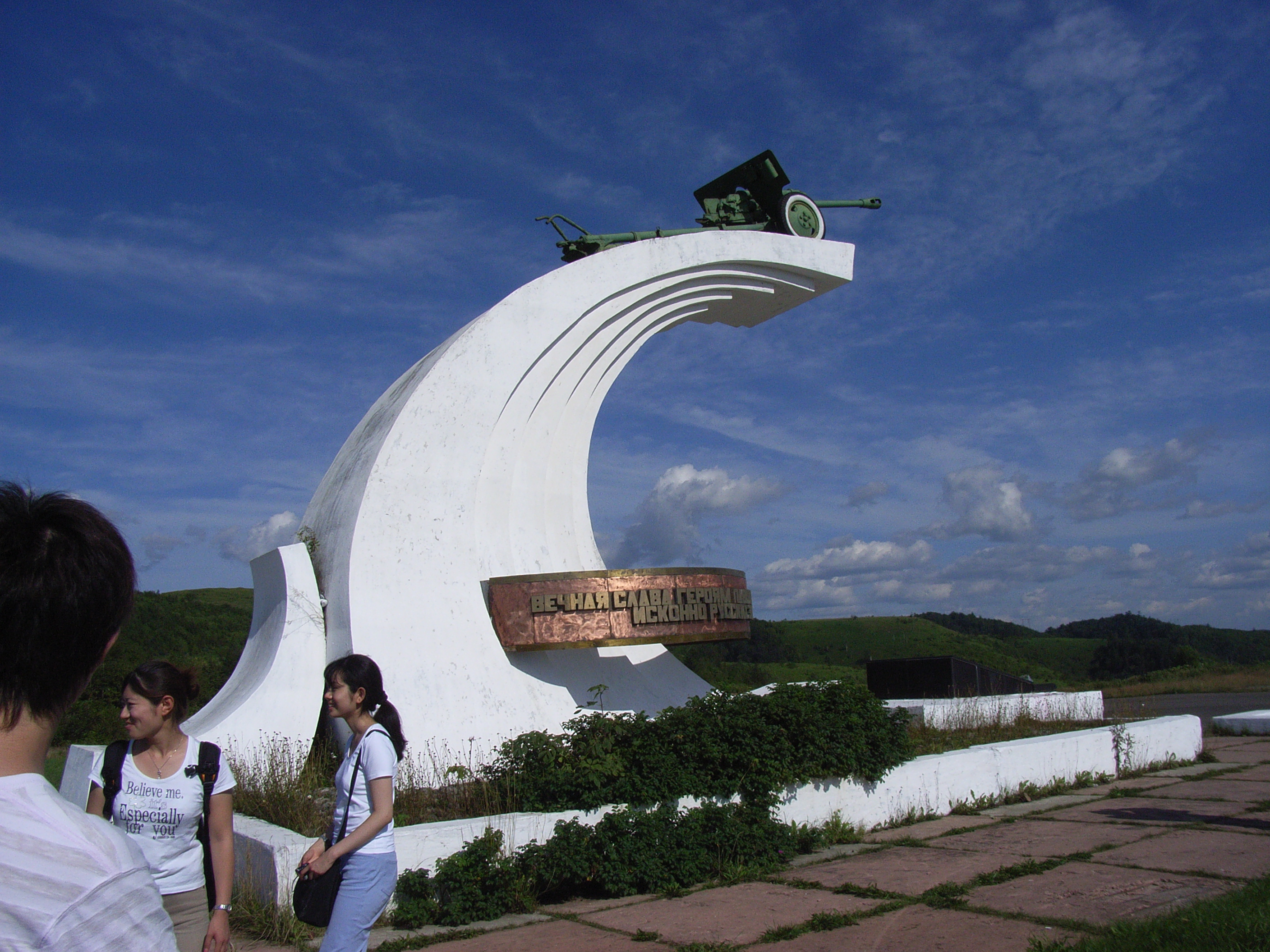 道路際で車を降りて、階段を登り、戦勝記念碑に寄った。ソ連軍が日本の侵略者たちから南樺太と千島を解放したということが記載されたモニュメントで、とても大きく立派なものだった。空に向かって高く作られた台座の上に戦車が載っており、その銃口は日本の方向を向いていた。碑の台座には、この附近の戦闘で戦死したと思われるソ連軍兵士の名が黒い石に刻まれ、まだ新しい花束が捧げられていた。