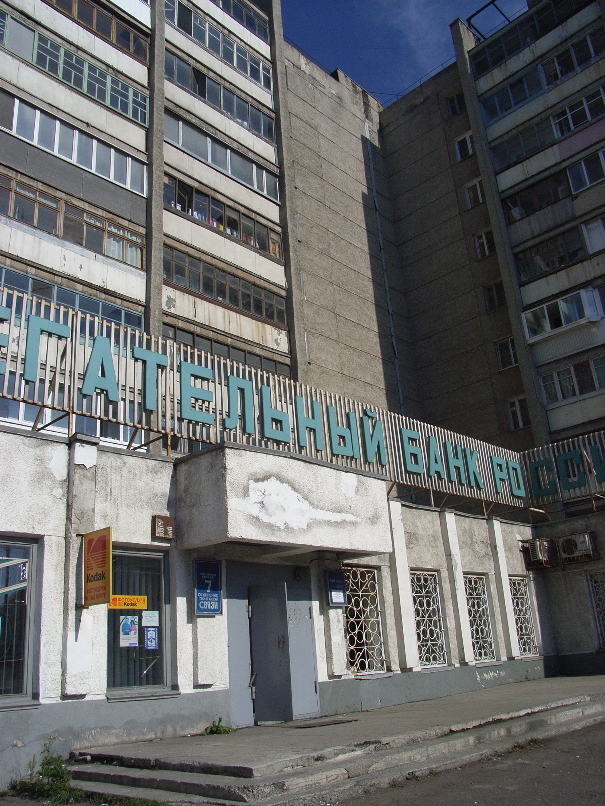 ミール広場から、戦前は、南浜町〜本町と呼ばれた通りを少し歩いた。このあたりは、段丘崖が、ロシアが今はソビエツカヤ通りと呼ぶ街路に面する、ソ連時代に建設された建物のすぐ裏手まで迫っている。ロシアにしては、土地利用が日本のようにせせこましい。ほどなく、旧真岡郵便局跡に着いた。これは、8月20日に参加した平和祈念祭の、あの九人の乙女の悲劇がおこった場所である。だが、着いてみると現在はコンクリート造りの銀行になっており、何の名残もない。もちろん、慰霊碑やプレートのようなものも設置されていない。目の前の建物は、ごく普通の社会主義建築である。事前に地図で調べておかなければ、ここがその悲劇の場所だったとは全くわからない。