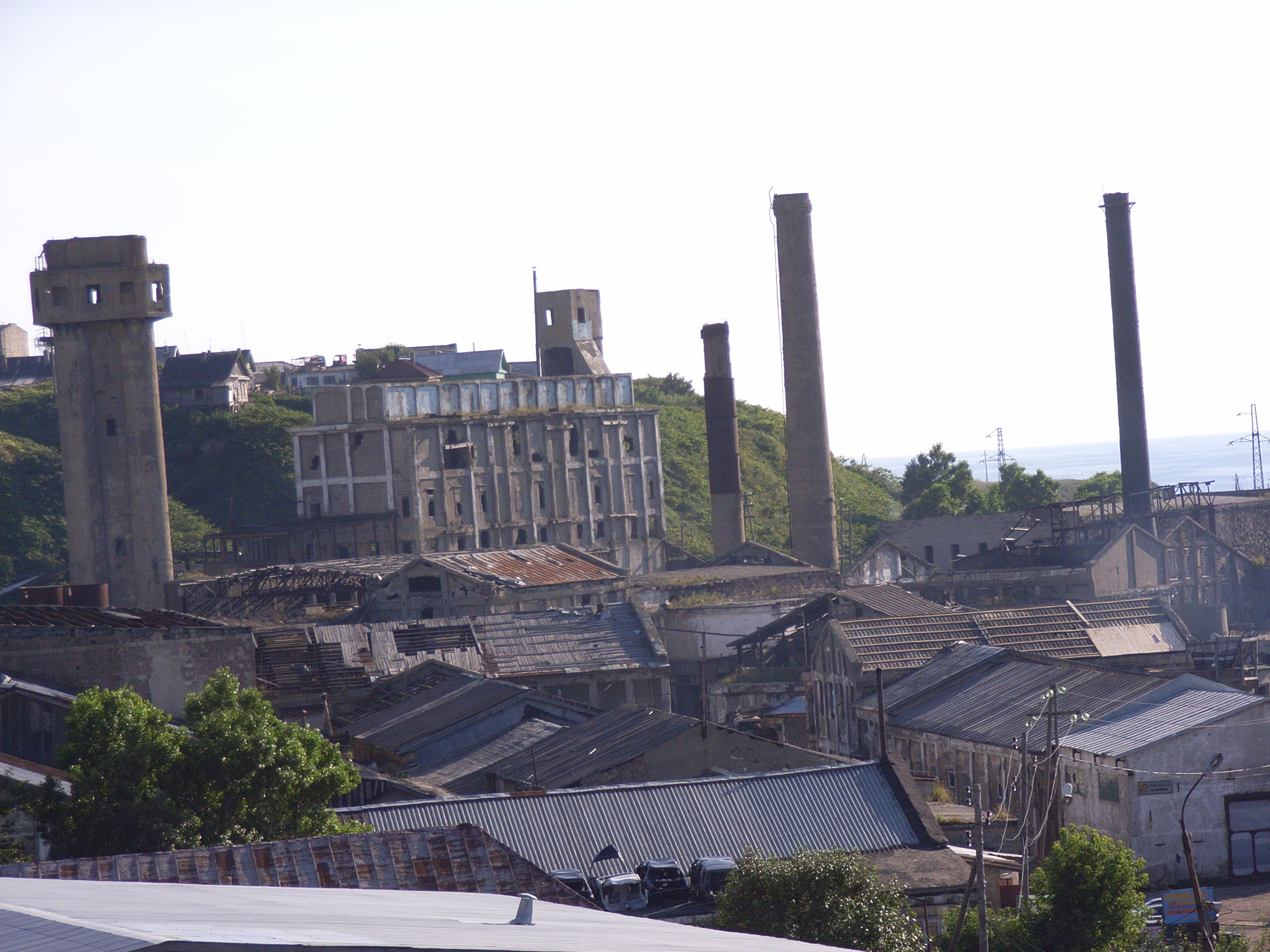 台車交換所のある場所から階段を登って、少し高いところにある道路から街を眺めた。ここから、昔の樺太工業が経営していた製紙工場の跡を見ることができた。今朝みたもののように、やはり大きくて存在感がある。豊原/ユジノサハリンスクもそうだが,このような工場以外にも、街中にかなり大きな建築物の廃墟があった。その一方、道路工事が行われ、道路が改良されているのも頻繁に見かけた。これは、サハリンプロジェクトの資金が流れ込んでいるのかもしれない。