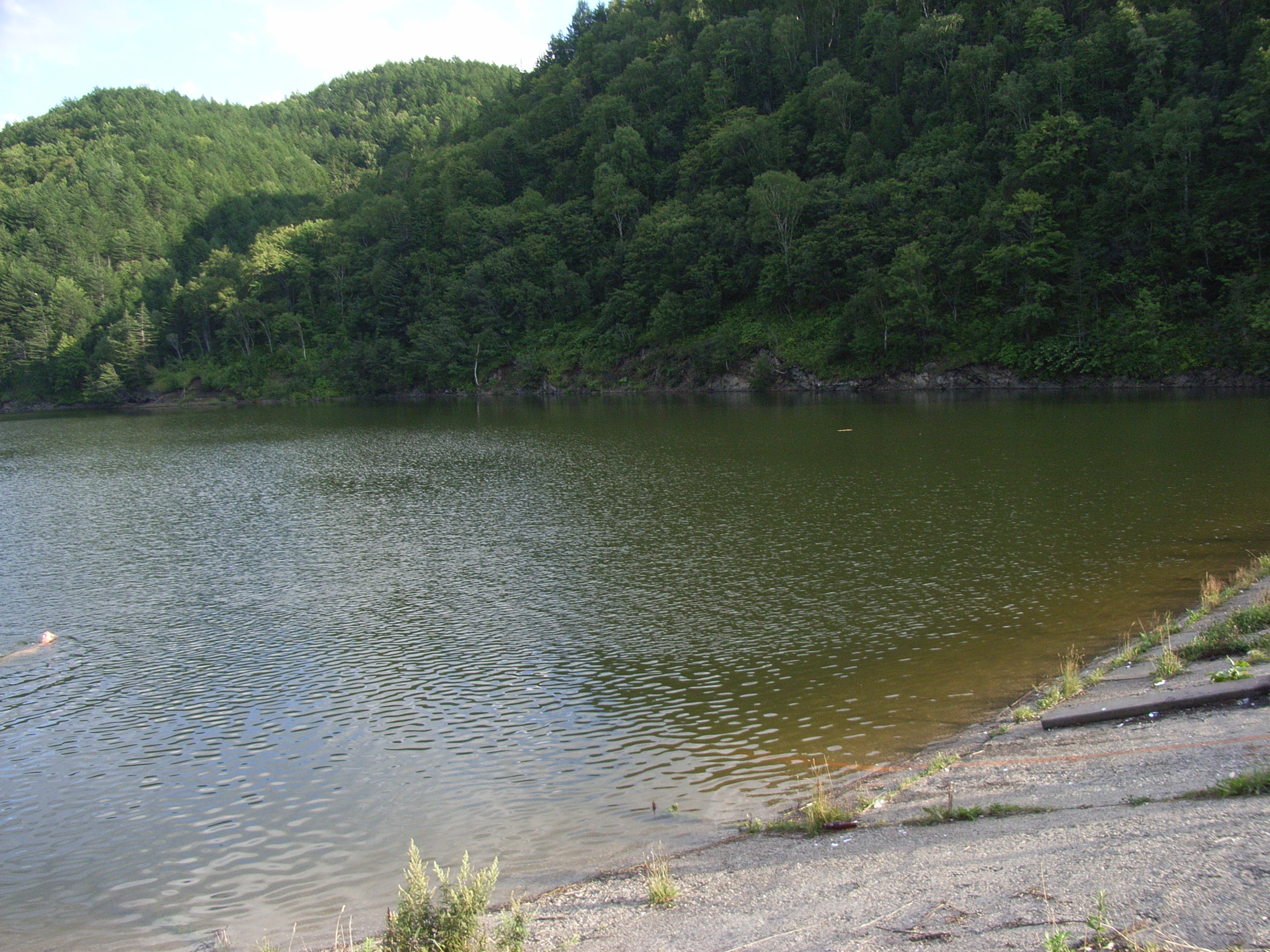 車は細くて車道ではない小道に入り、今まで以上にゆれた。ここで問題が発生した。旧豊真線ループのある場所までは車でいけないのだ。とにかくできるだけ近くまで行く道を選び、車はタイヤがいつ取れてもおかしくないほど激しく上下左右に揺れながら、手井/タイノエ貯水池のダムのほとりまで進んだ。この貯水池は、日本統治時代に樺太工業がつくったもので、工業用水道水源として使用されていたものだったが、ここで泳いでいる人が何人もいた。レジャー施設が少ない樺太/サハリンではこのような貯水池もレジャーに活用されているようだ。しかし、貯水池は深いので、水泳は危険ではないのだろうか。他には釣りをする人や、キャンプ用と思われるテントもあった。