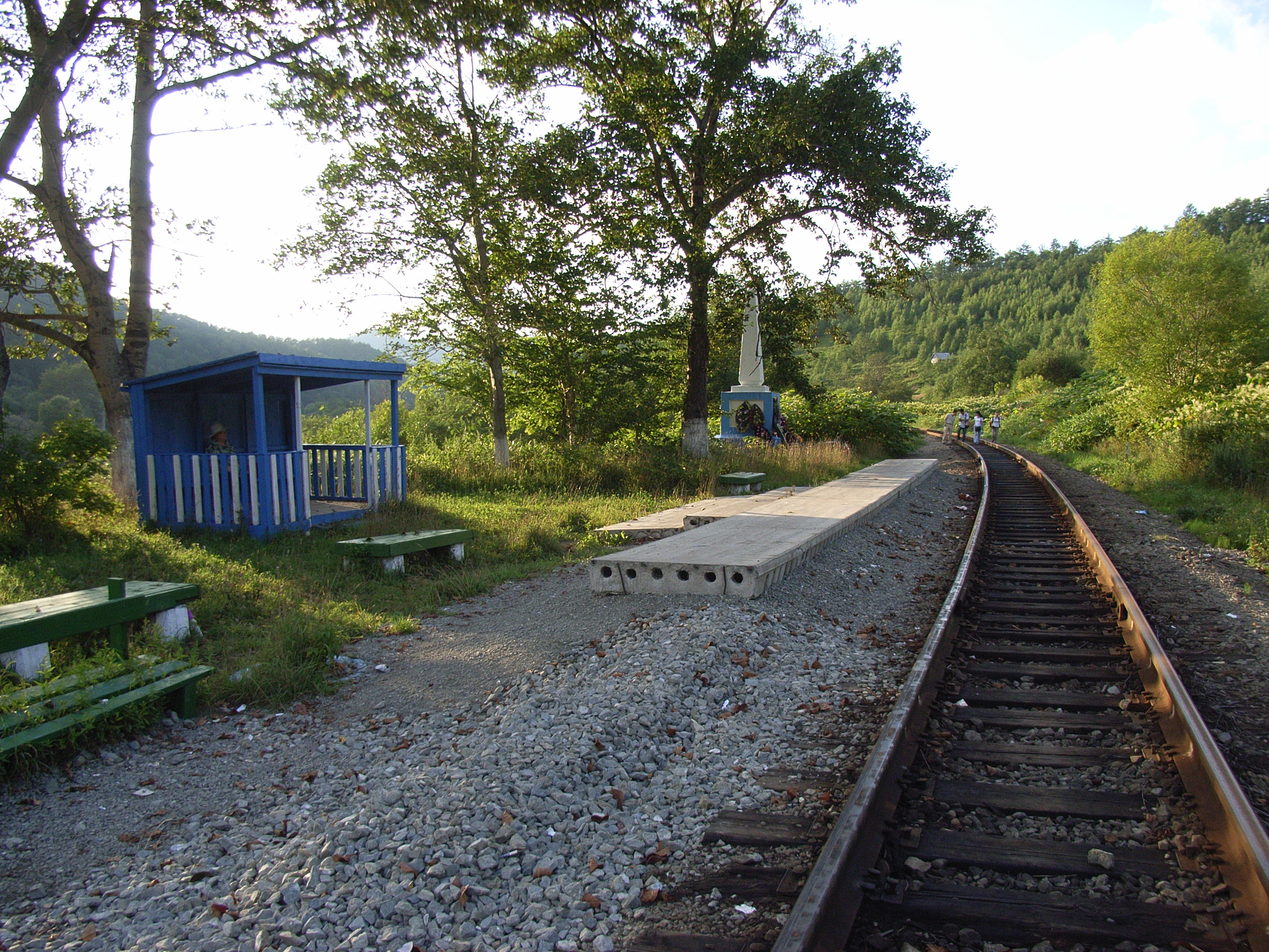 はじめは新鮮だったが、だんだん枕木の間隔に歩幅をあわせなければならず、歩きづらいことに気付いた。前を見ると、どこまでもどこまでも淡々と日本と同じ幅の線路が続き、先が見えず、気が遠くなった。周りは山に囲まれ、私たちゼミ生以外誰もいなかったため、なんだか異国の地にいる感じがしなかった。先頭と最後尾の人の間隔はひどく開き、線路が曲がっていたせいもあるが、ついには最後尾から先頭の人は見えなくなってしまった。途中、池ノ端/ニコライチュク駅のホームであるコンクリートの細長い台や、何かの記念碑を見た。記念碑には、花輪などが供えられていた。景色は湖のような広い貯水池がいつの間にか見えなくなり、かわりにダーチャのような集落が見えた。