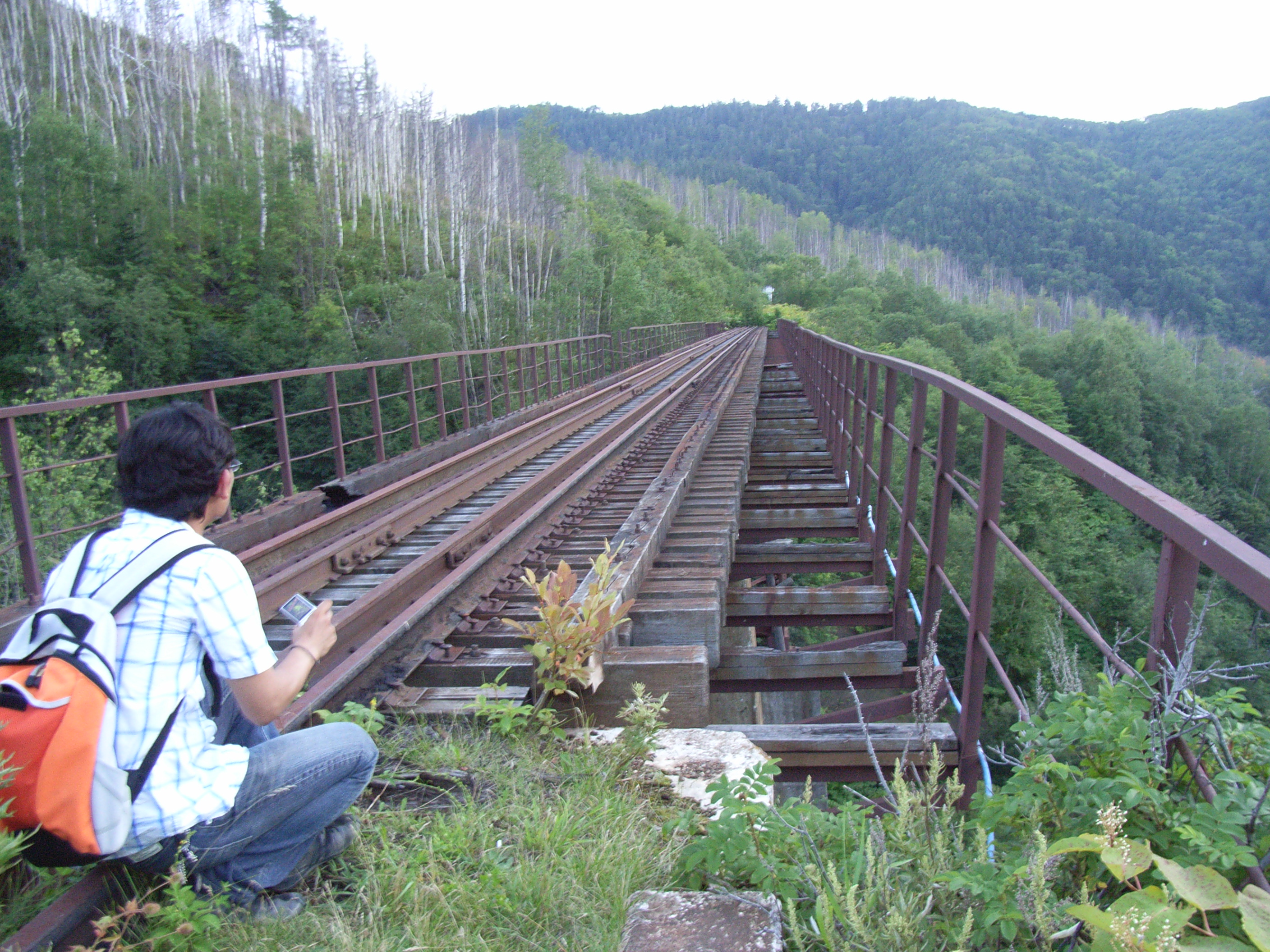 鉄橋の入り口付近で私たちはようやく腰を下ろした。鉄橋から豊原/ユジノサハリンスク方面に向かう線路は、すでに草に埋もれ、荒れ果てていた。鉄橋の枕木の間からは下の線路が見え、危なっかしかった。老朽化しているので、私たちは鉄橋には足を踏み入れないことにした。さきほどのトンネルに入っていった線路がグルッと山を登って、約36mの標高差を稼ぎ、この鉄橋に続いているのである。私たちはこのようにループした線路が重なっている様子を観察した。