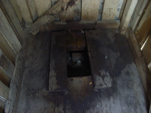 中に入ってみたが、ドアを閉めてしまうと、電気が通じていないためか、中が真っ暗になってしまい、少し怖い。床には、板が張られていた。そしてその真ん中には穴が掘られており、利用者はその穴にまたがるのである。非常にシンプルかつ原始的な「ぼっとん便所」であった。また、穴の中には便だけでなくペットボトルや缶までも捨てられてあった。それらは、なかなかの臭いを発しており、周りにはハエがたかっている。しかし、使用頻度は高いので、汲み取りなどの管理はある程度行われているようであった。