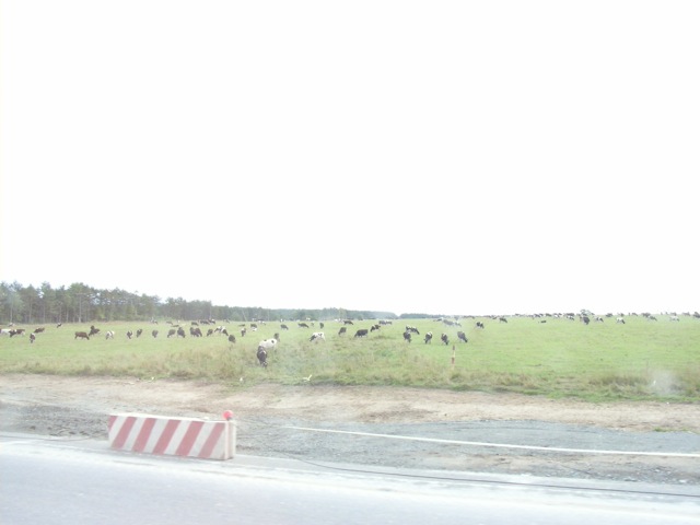 しばらく走ると、道路の左側一面に牧場が広がった。ざっと見る限りでも100頭以上の牛がいる。この後も所々に牧場は見かけたが、ダーチャを中心とした個人農業が中心の樺太/サハリンでは、大規模な耕作地というのは見られない。