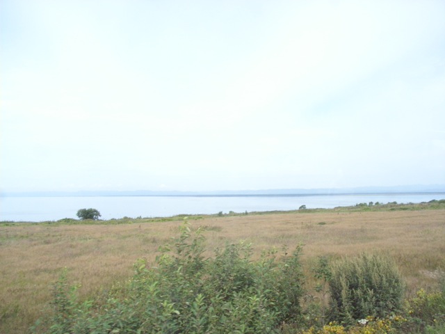 大泊/コルサコフに近づくと、右側に亜庭/アニワ湾が見えてきた。さらにその前方には樺太/ユジノカミショビ山脈の連なる半島があり、西能登呂/クリリオン岬までつながっている。こうやって遠くまでよく見えるのは、道路が丘の上を通っているからである。この付近は海岸段丘になっており、かつて日本時代は、幹線道路が零細な漁村をむすんで段丘の下を通っていた。現在、段丘上には所々に集落が存在している。海岸から段丘面へという、日本からソ連への移行に伴う都市建設の場所の変化は、道路にも当てはまるようだ。
