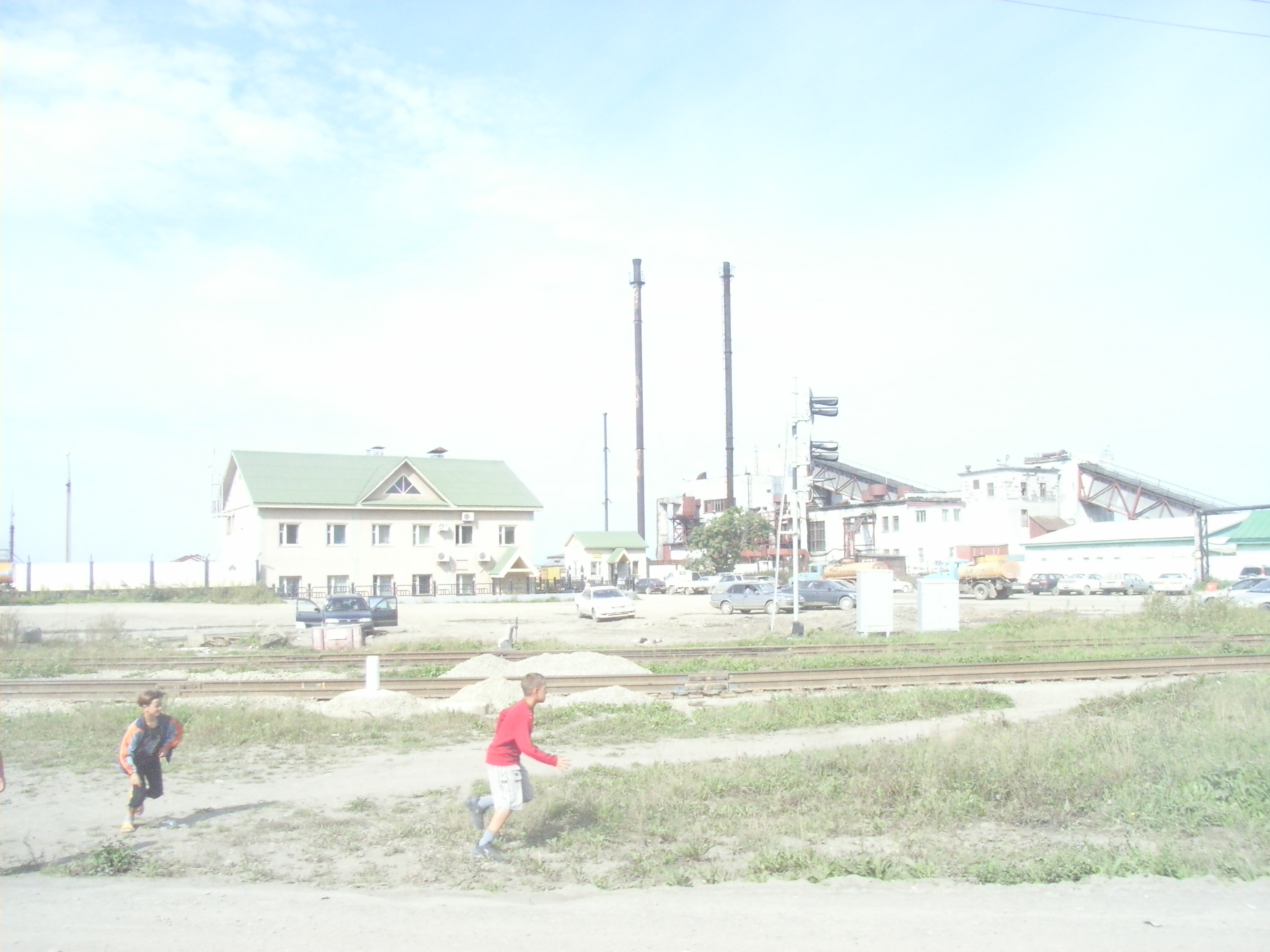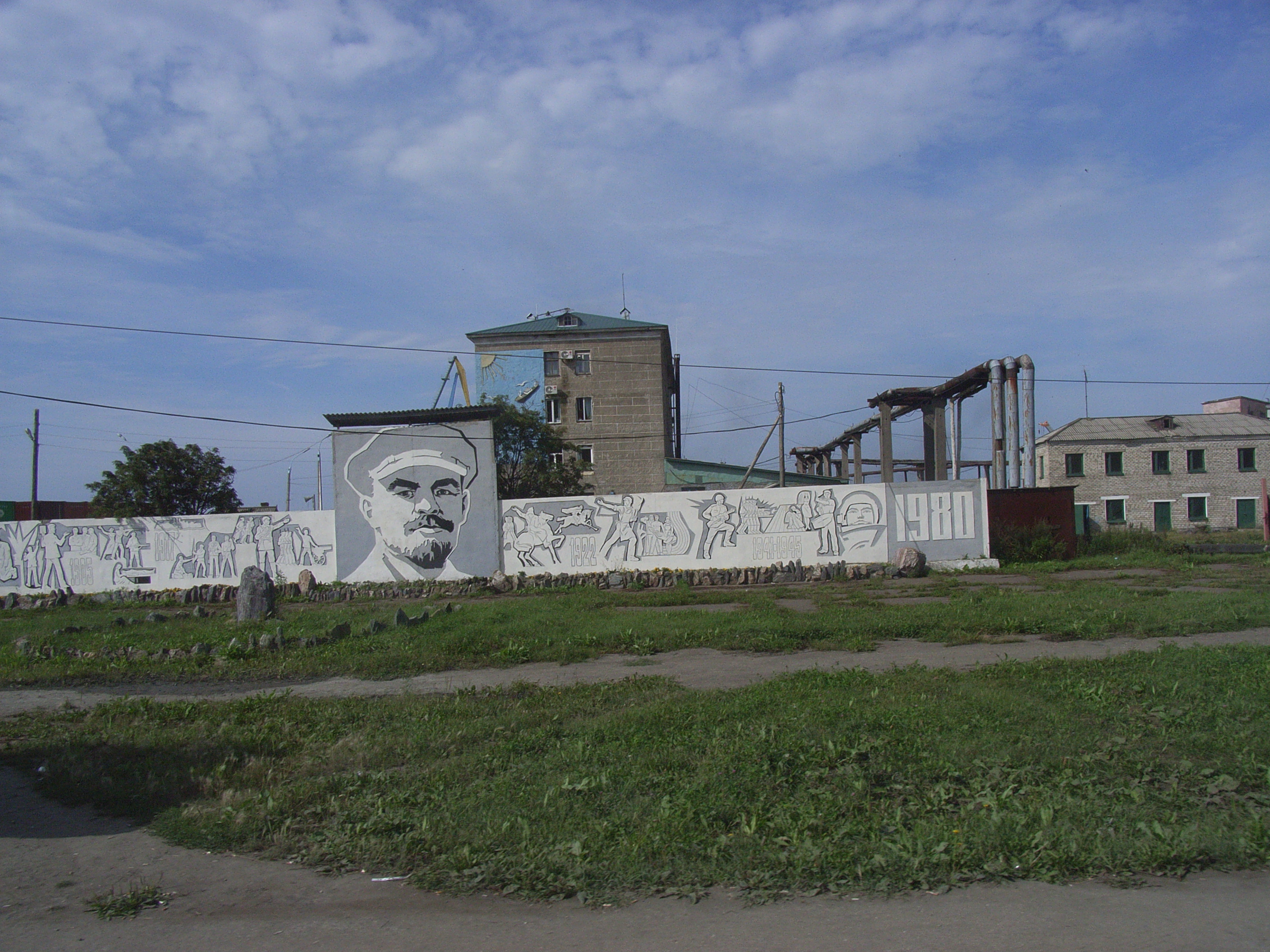 豊原/ユジノサハリンスクからの幹線道路から駅前/ヴァクザーリナヤ通りという線路沿いの道に入って、しばらくしてから車を停めた。線路を見ると、ここでも線路拡張工事が既になされているようで、三本のレールが延びている。線路といっても、現在は列車がやってくる頻度が低いので、線路付近の原っぱを子供たちが駆け回っていた。また、付近には「1980」という文字と人々の絵、ある将校らしき人物の似顔絵が書かれた、ソ連時代の歴史モニュメントが残っている。