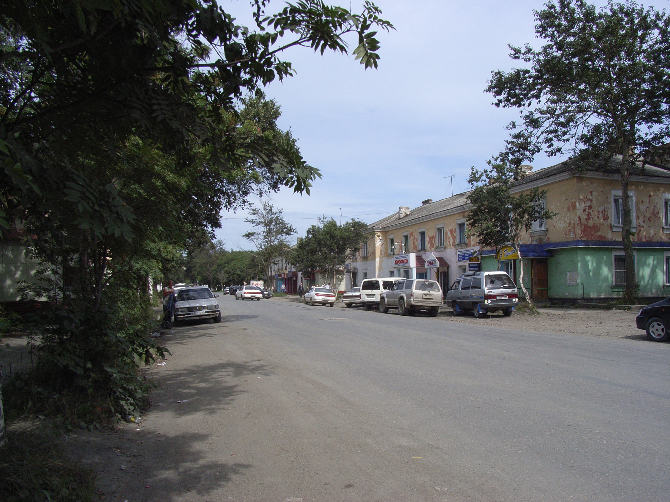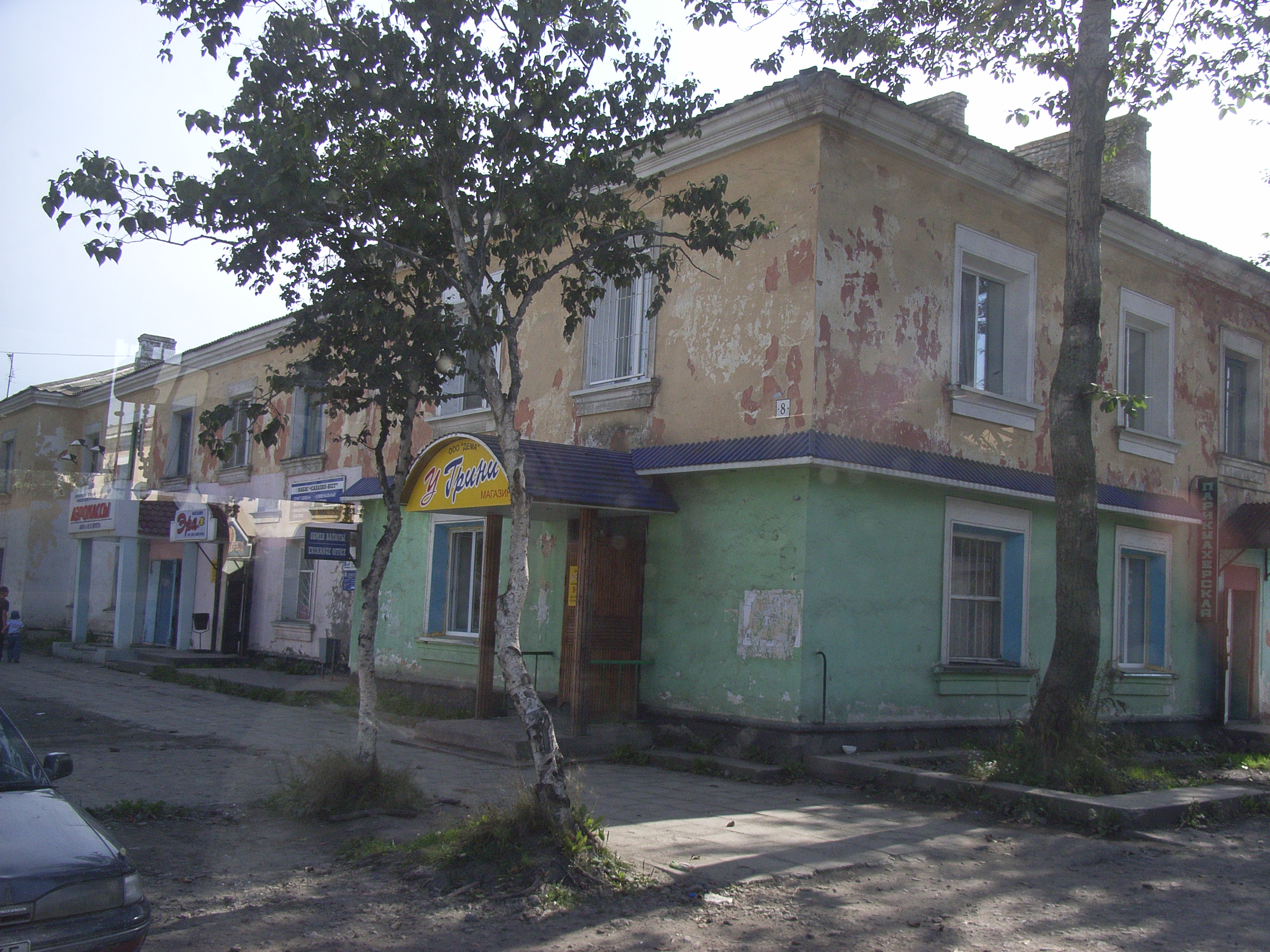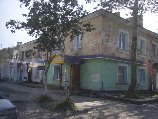 本町大/ソビエツカヤ通りに入った。ここは大泊/コルサコフのメインストリートであり、日本統治時代には、当時の樺太/サハリンで唯一、路面電車が走っていた。現在ではその面影はないが、都市の商業中心としての役割においては変わっていない。道沿いには、人口4.4万人(2005年)のこの都市を支えるたくさんの小規模な商店が軒を連ねている。そして、それらの多くは、社会主義時代に建てられたアパートの一階にある。