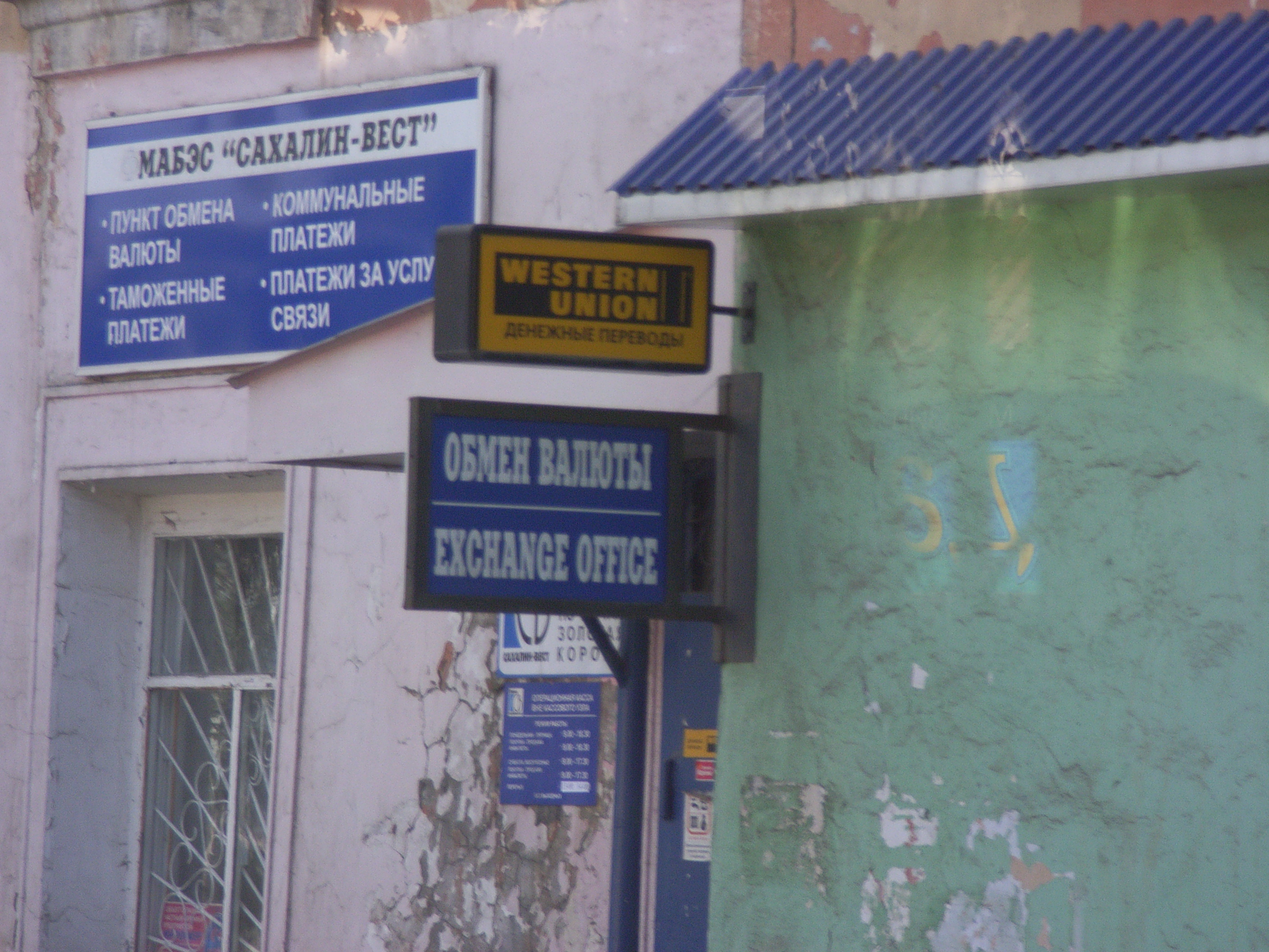 その中に私たちは、“WESTERN UNION>”と書かれた看板を発見した。ウェスタン・ユニオンとは、もともと米国の電報会社であり、電報が衰退したいまは、海外電信送金を主要なビジネスとしている。昨年水岡ゼミが訪問した、マケドニアやボスニア・ヘルツェゴビナなど、外国人労働者を送り出している国々には、たくさんこの会社の営業所があった 。大泊/コルサコフには、サハリンプロジェクト関連事業や市内の建設事業に従事する外国人労働者が多いので、その仕送りのための送金需要があるのだと思われる。