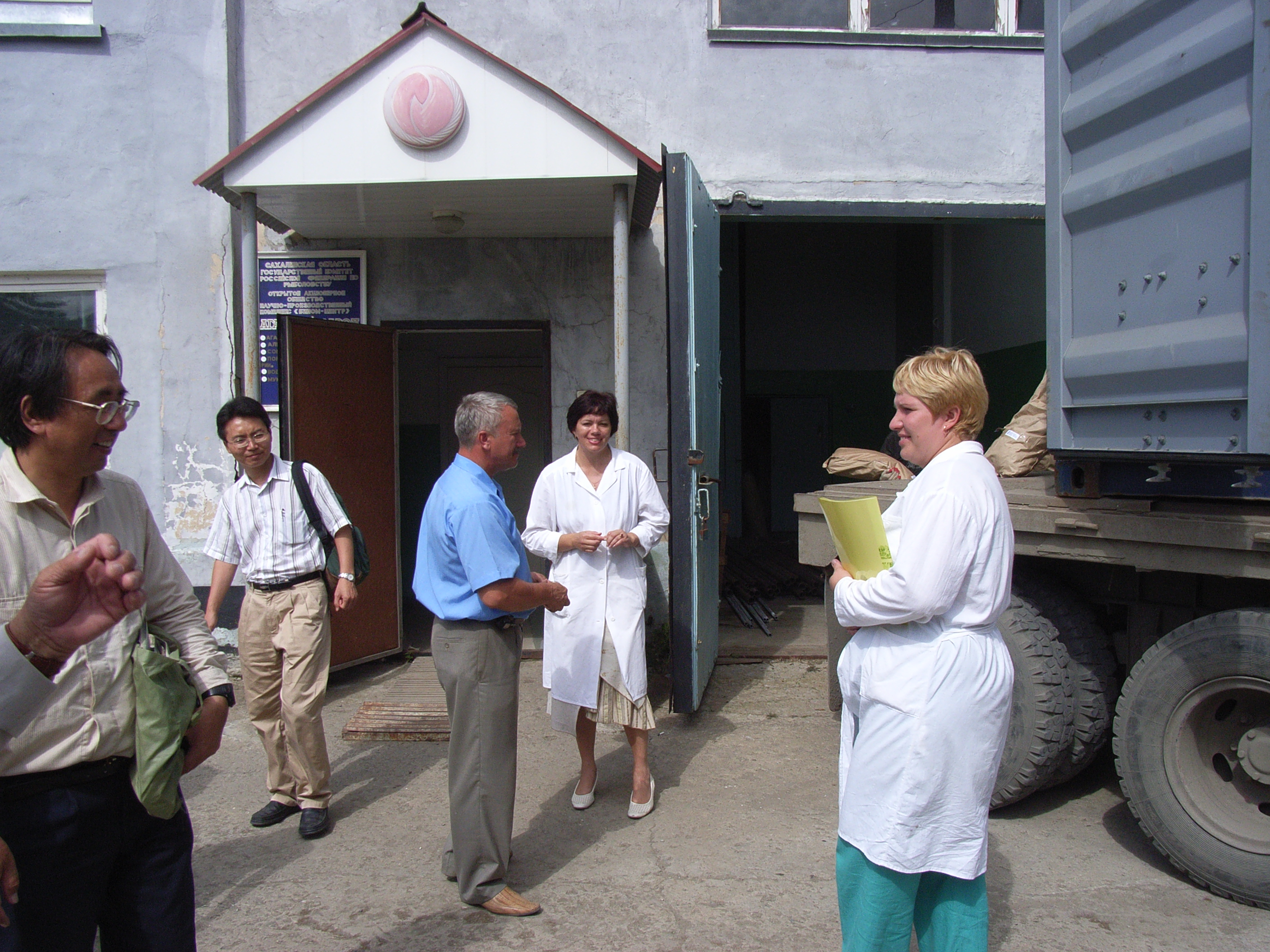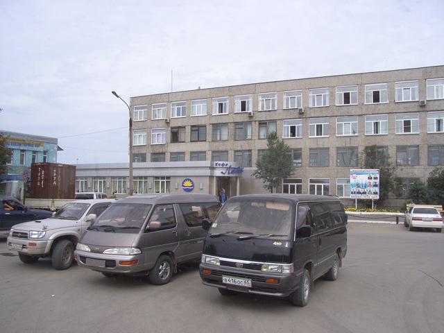 10数分走ると、大泊/コルサコフ港に近い広場に到着した。この広場は、車が適当に停めてあり、駐車場のような雰囲気である。周囲にはいくつか社会主義時代に建てられた5階建て前後のビルがあり、そのうちの一棟は港湾事務所のビルである。一階部分が広場側へ張り出すように増築されている部分には、レストランが入っていた。港湾事務所が土地もしくは建物を貸しているようである。公的施設が民間的なことをするのは。市場経済化後の新しい現象であろう。私たちはそこで昼食をとることになった。