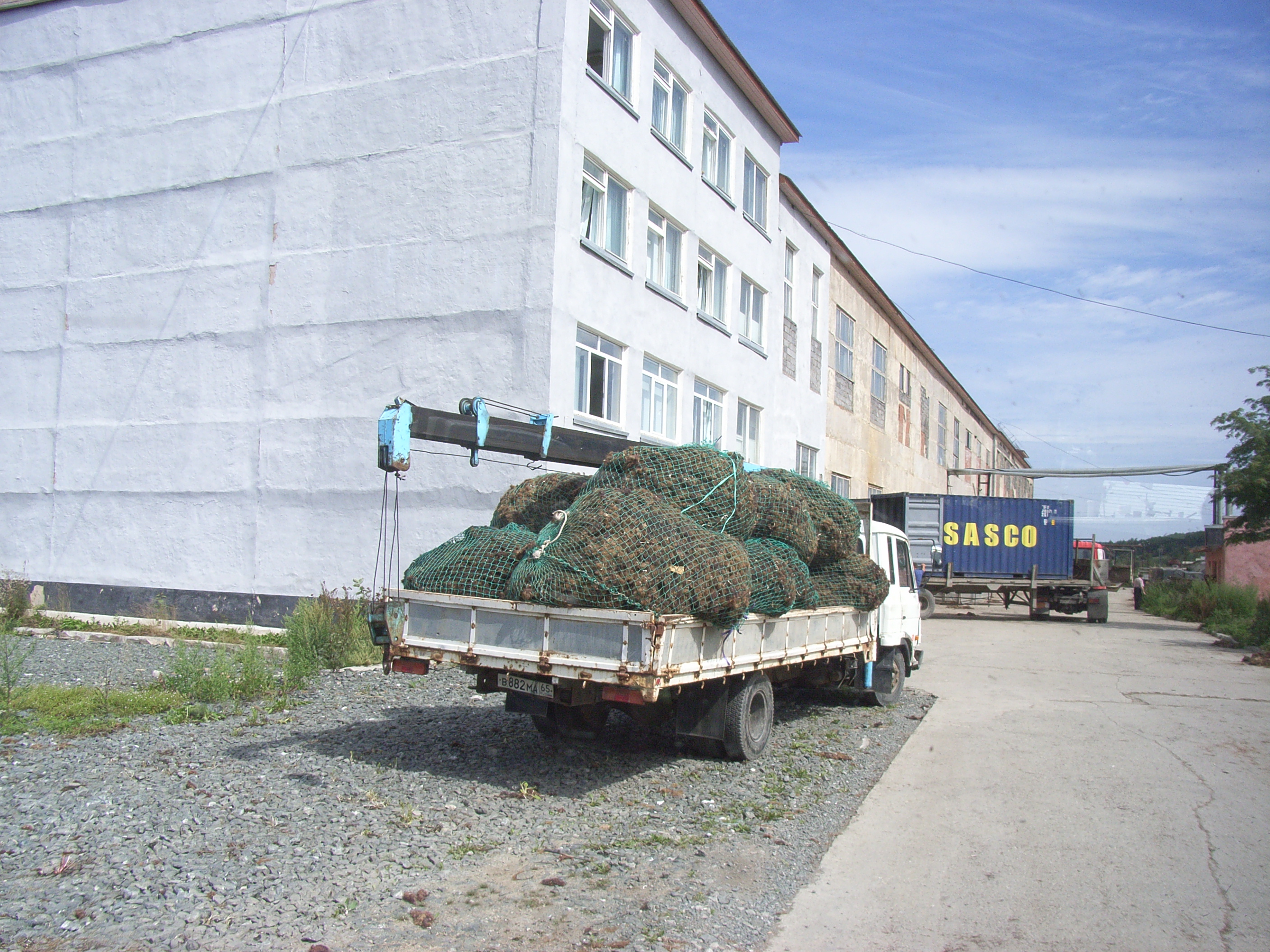 工場を出ると、前には“SASCO”と書かれたコンテナを積んだトラックが停まっており、ちょうど製品が積み込まれるところであった。また原料を大量に乗せたクレーン付トラックが別のところに停まっている。