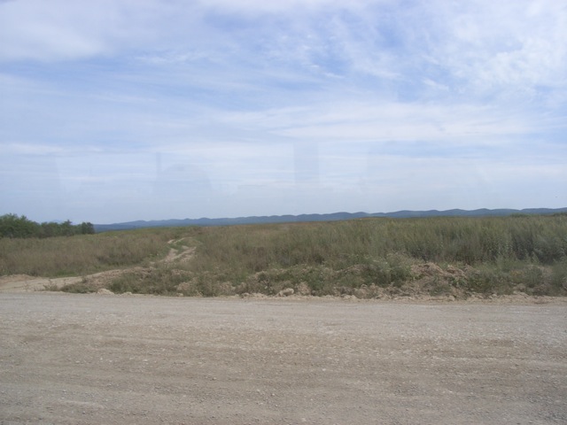 さらに中心部から離れると、草原が広がり、そのうちに砂利道になって殺風景になってきた。また、私たちの向かっているLNGプラントへ向かうらしいダンプカーも走っている。