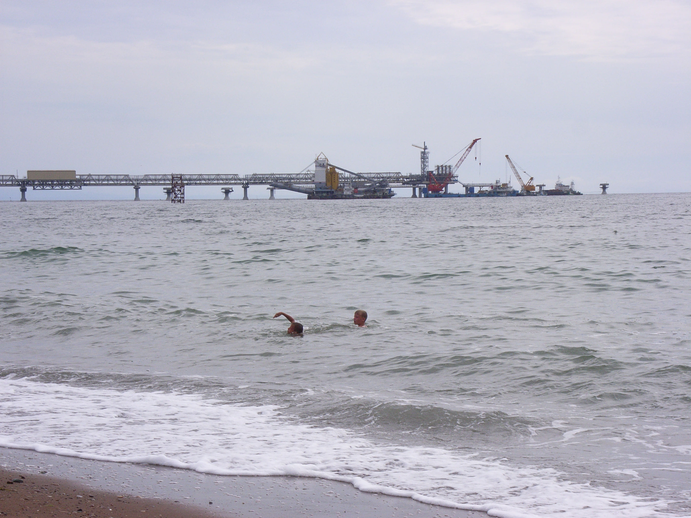 敷地からは、LNG輸出用の桟橋が、かなりの長さで突き出している。亜庭/アニワ湾内は流氷の心配はなく、この桟橋は年中使用可能だそうだ。流氷は樺太/サハリン東南に突き出す中知床/アニワ岬にせき止められて、湾内に入ることができないからである。LNGの輸出がわざわざ採掘地から数100km離れた場所で行われることになったのは、このためであろう。なお、建設中、資材や物資の搬入はその横にあるコンクリートの仮桟橋から行われたが、現在は本桟橋が完成したので、それは終了しているという。