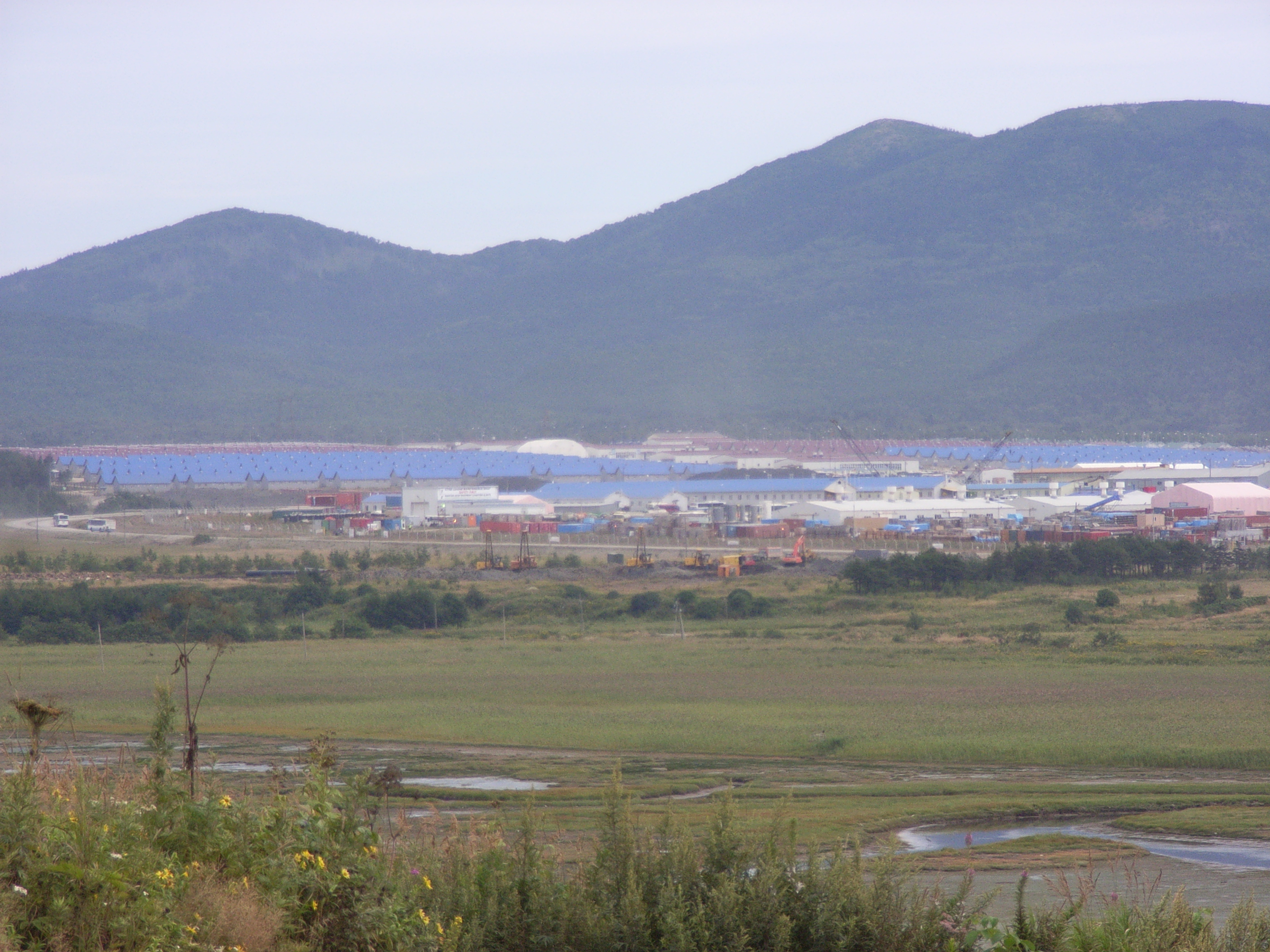 これらの施設の内陸側には、青い屋根を付けた1.2階建て程度と思われる建物が数え切れないほどに並んでいる。それらは建設労働者及びその家族用の宿舎であり、5,350人を収容することができる。現在この工事には30ヶカ国もの外国企業が参加している。2005年4月のデータによると、約6,800人いる建設労働者のうち、地元樺太/サハリンの出身者は約半数の47%にすぎない。他のロシア人として、ロシア極東地域外の出身者が27%、ロシア極東地域出身者が8%いる。18%は外国人である。これには日本人も200〜300人含まれる。