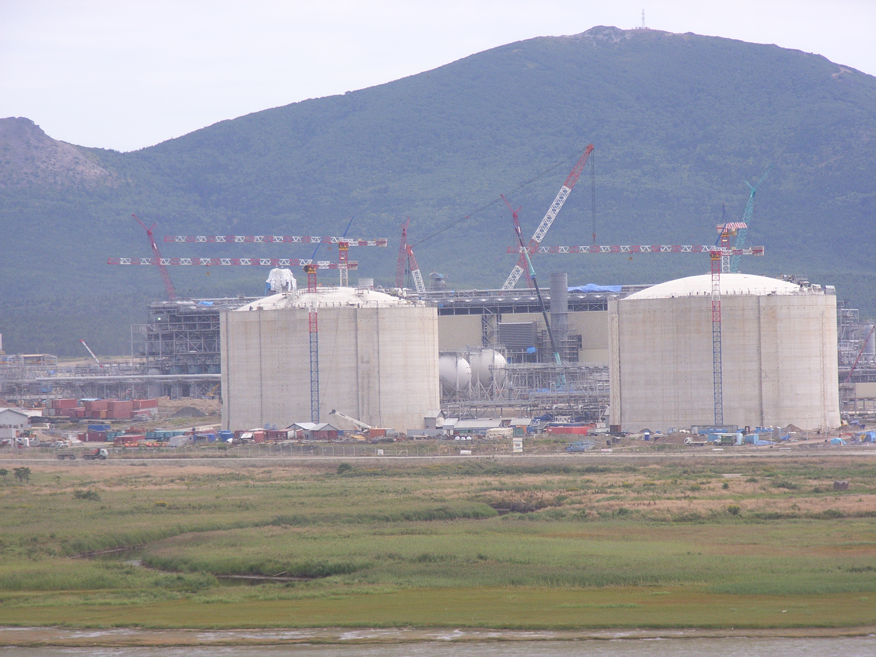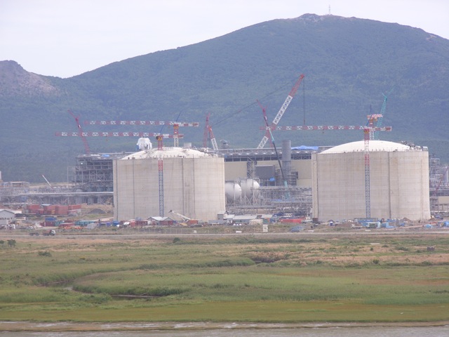 LNGプラントとは天然ガスを液化する工場であり、生産能力は、年間960万トン。将来、樺太/サハリン北東沖のガス掘削地からパイプラインを通ってきたガスを液化して、プラント沖の桟橋から海外に輸出することになっている。